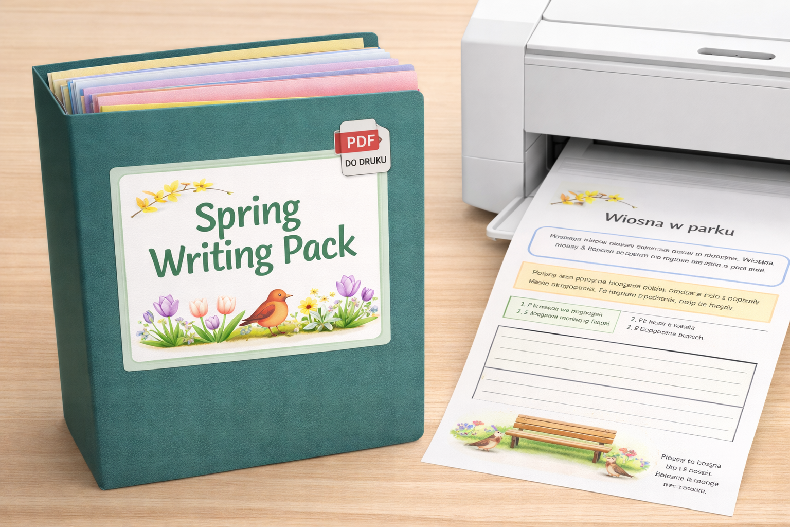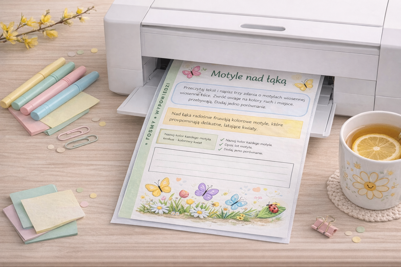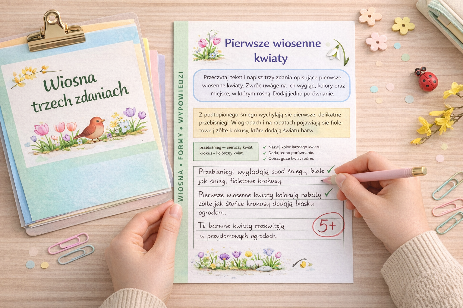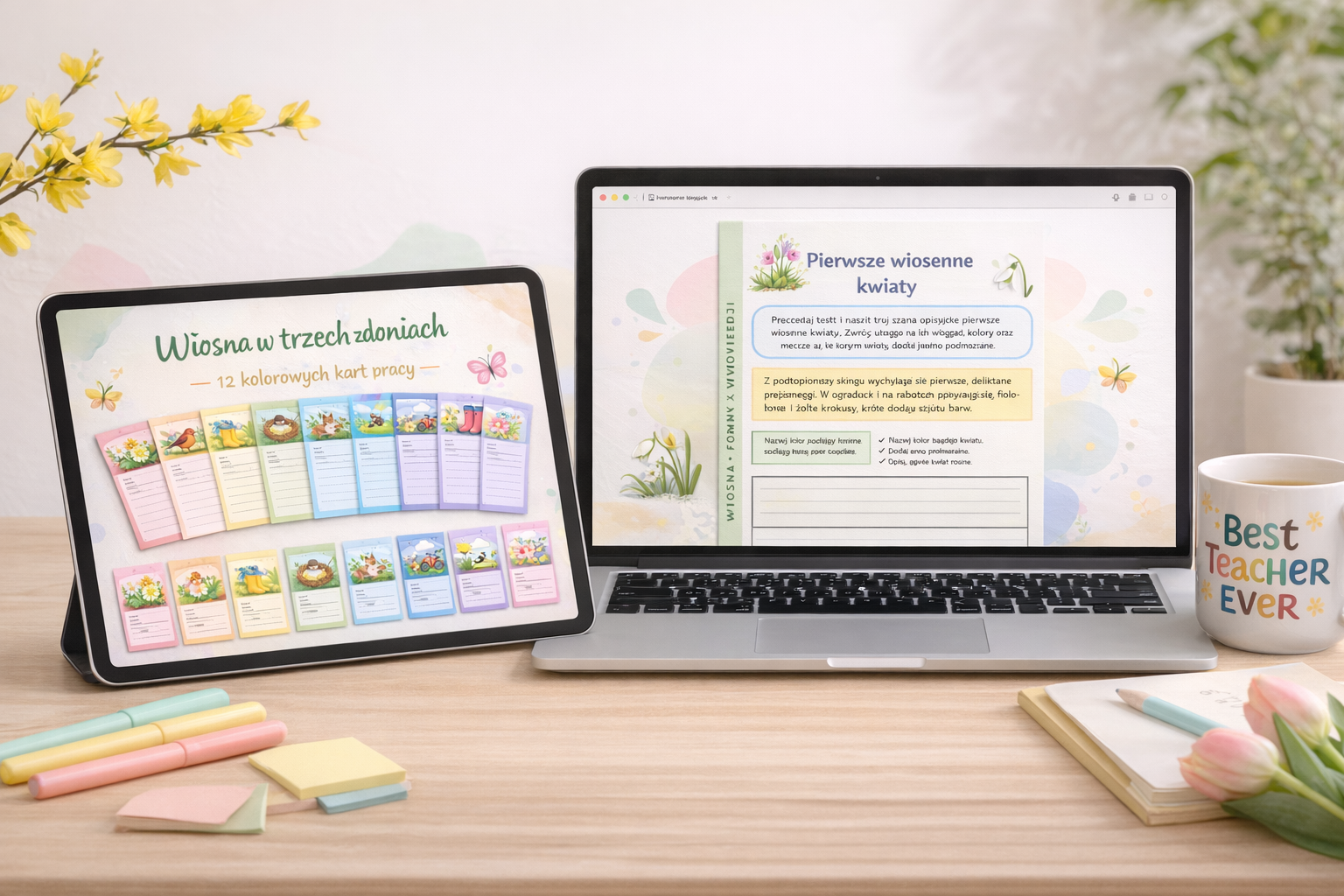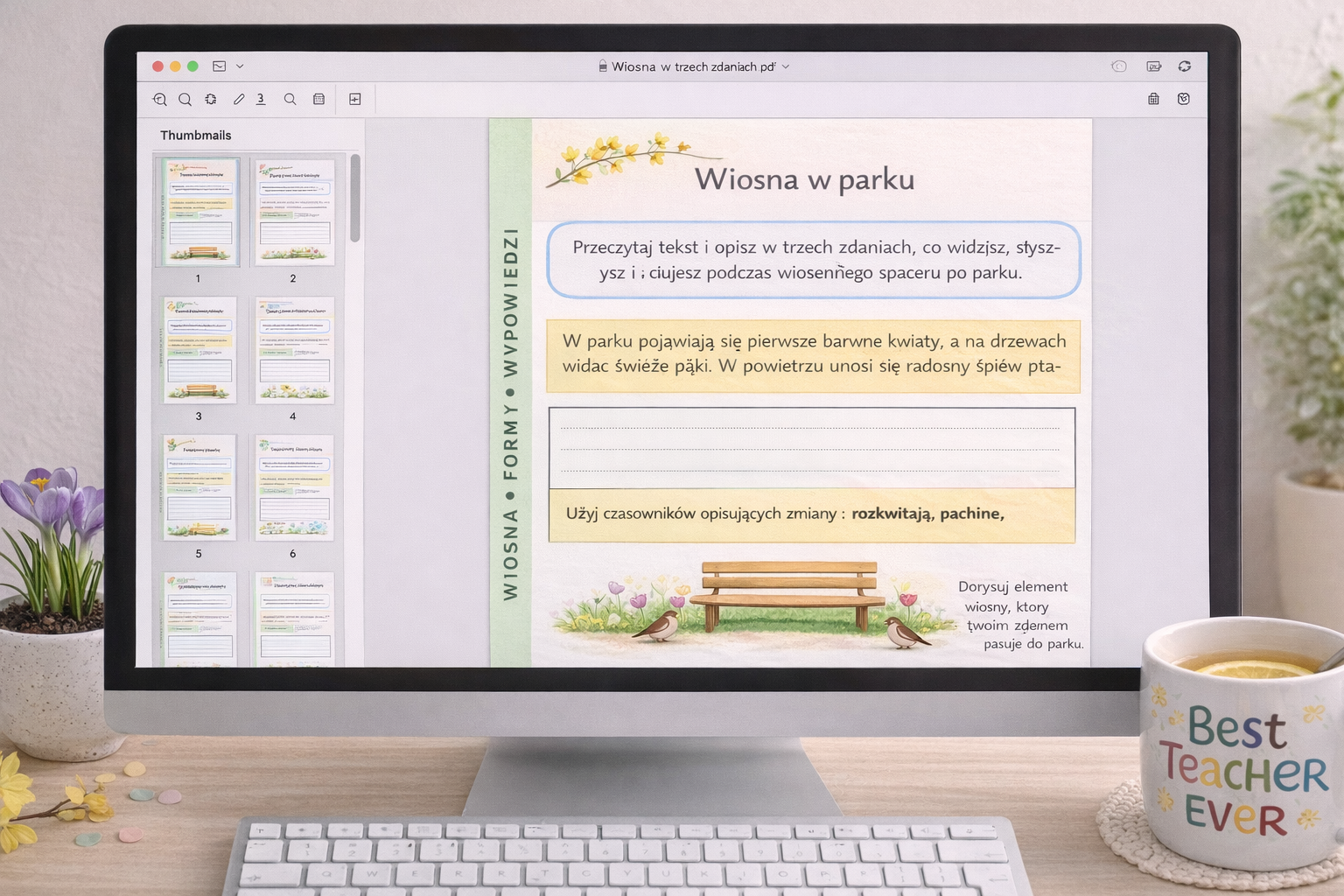 Pastelowe ilustracje, przemyślane kompozycje i wiosenne motywy — materiał przyciąga wzrok i motywuje do pracy.