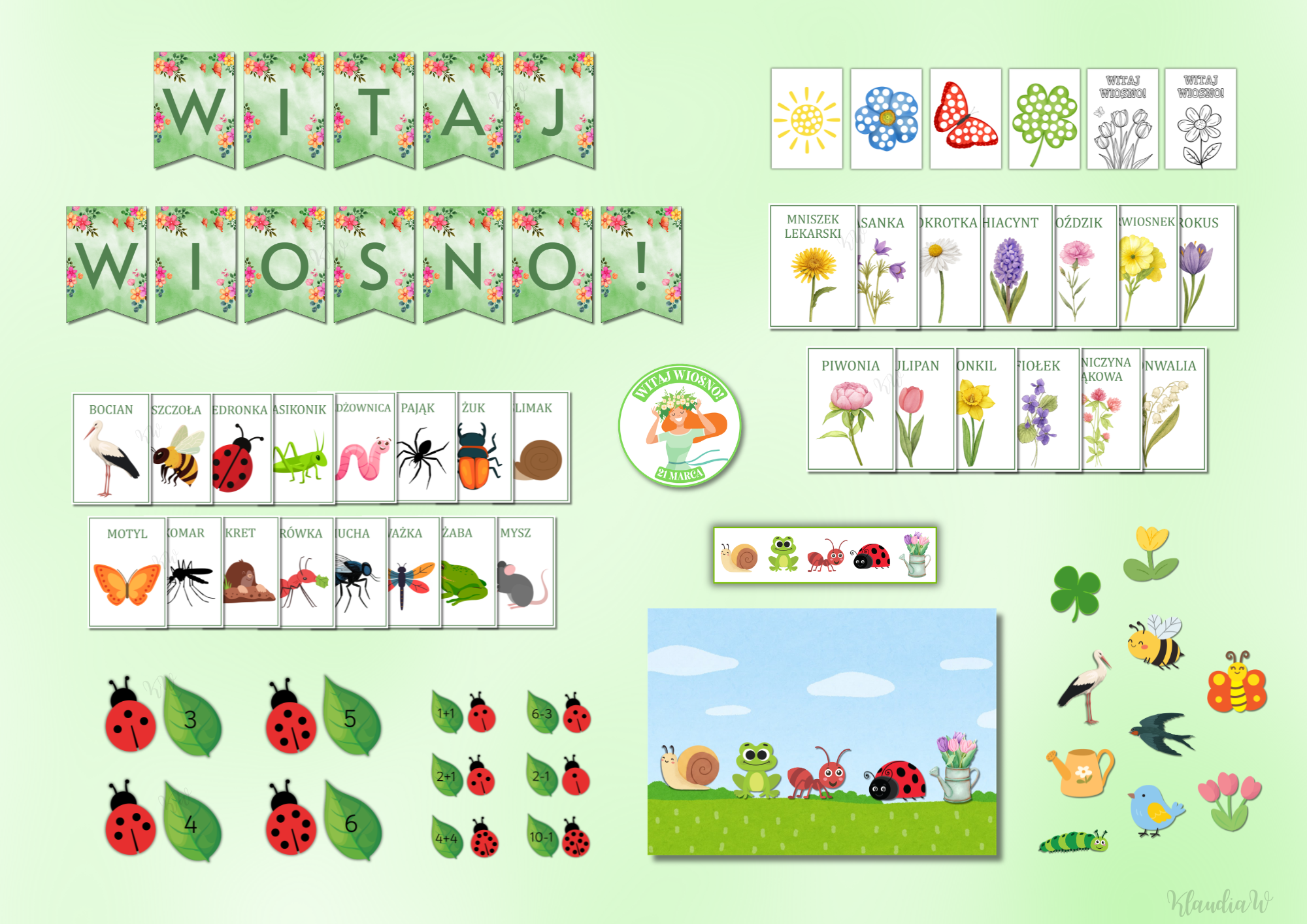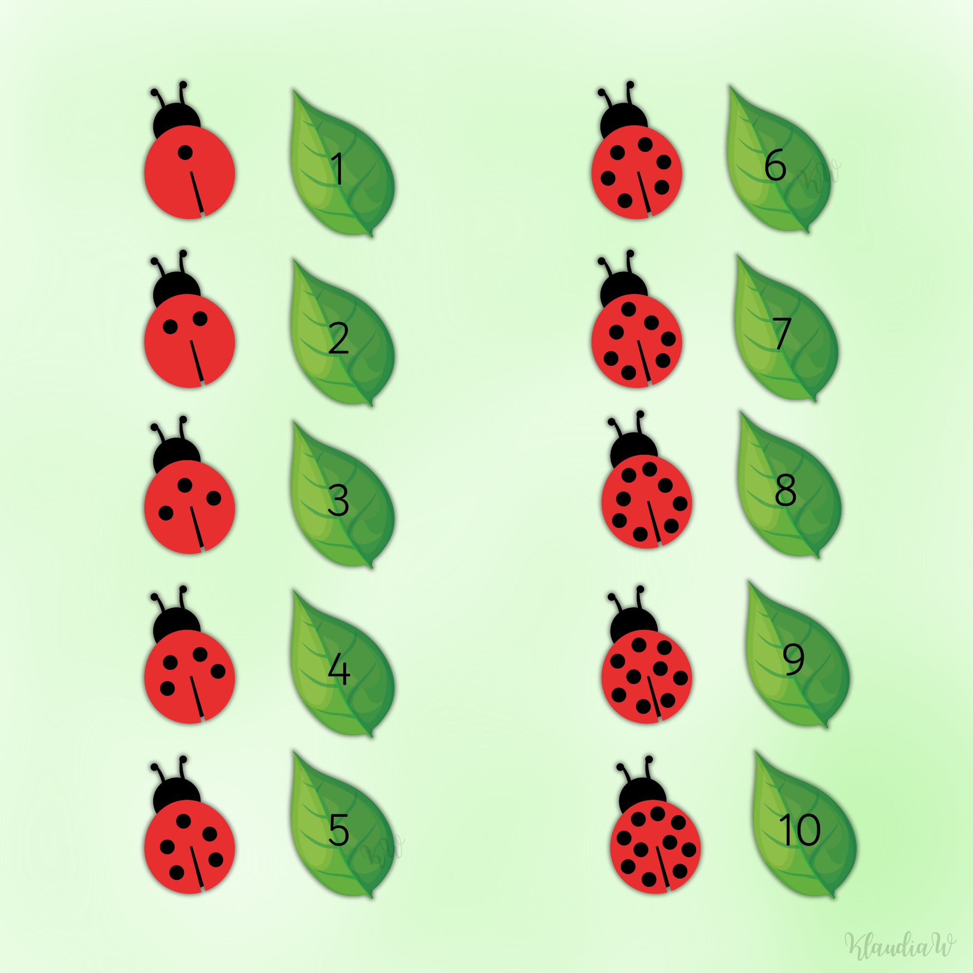 - liczenie i działania matematyczne w zakresie do 10 (10 biedronek z numerami od 1 do 10, 10 listków z odpowiednią liczbą kropek i18 listków z działaniami matematycznymi - dodawanie i odejmowanie).
