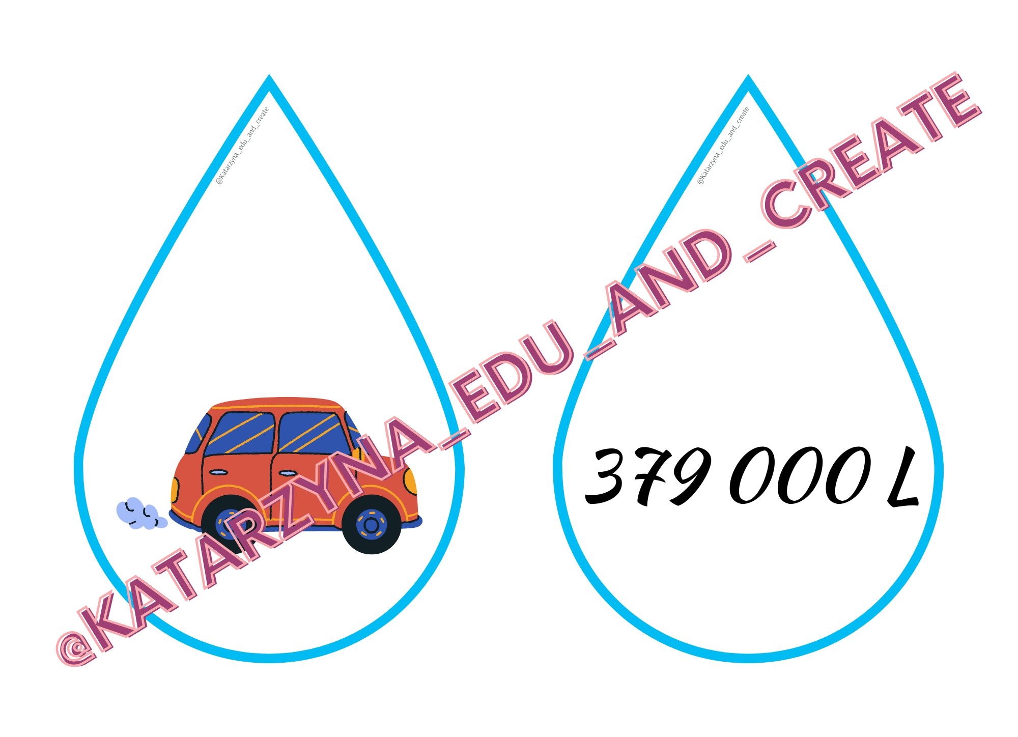 Plik zawiera 34 strony z memory z kroplami wody, wewnątrz których umieszczona jest ilość wirtualnej wody potrzebna do wyprodukowania danego produktu oraz nazwa danego produktu.