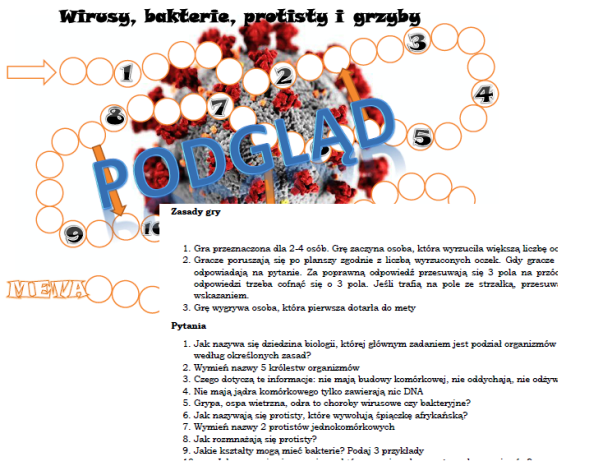 Zapraszam do zakupu gry planszowej przeznaczonej na lekcję powtórzeniową dla klasy 5 z działu "Wirusy, bakterie i grzyby". Plik zawiera grę planszową, zasady gry oraz 14 pytań i odpowiedzi z podręcznika dla klasy 5 szkoły podstawowej z serii Puls życia (Wydawnictwo Nowa Era)