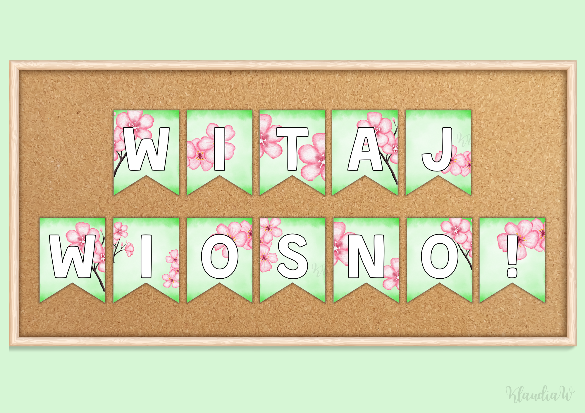 W pliku PDF znajduje się girlanda z napisem „WITAJ WIOSNO!”
