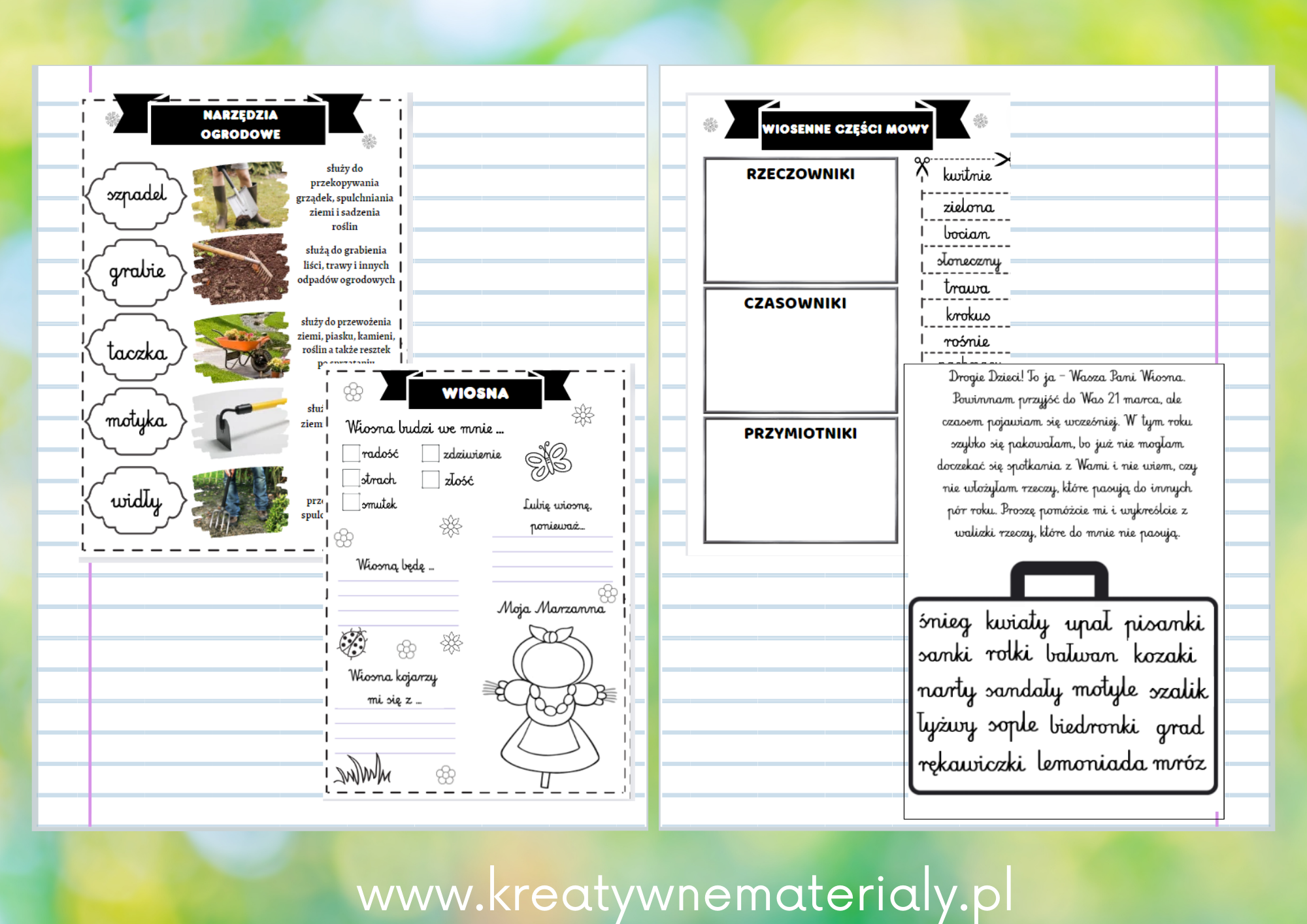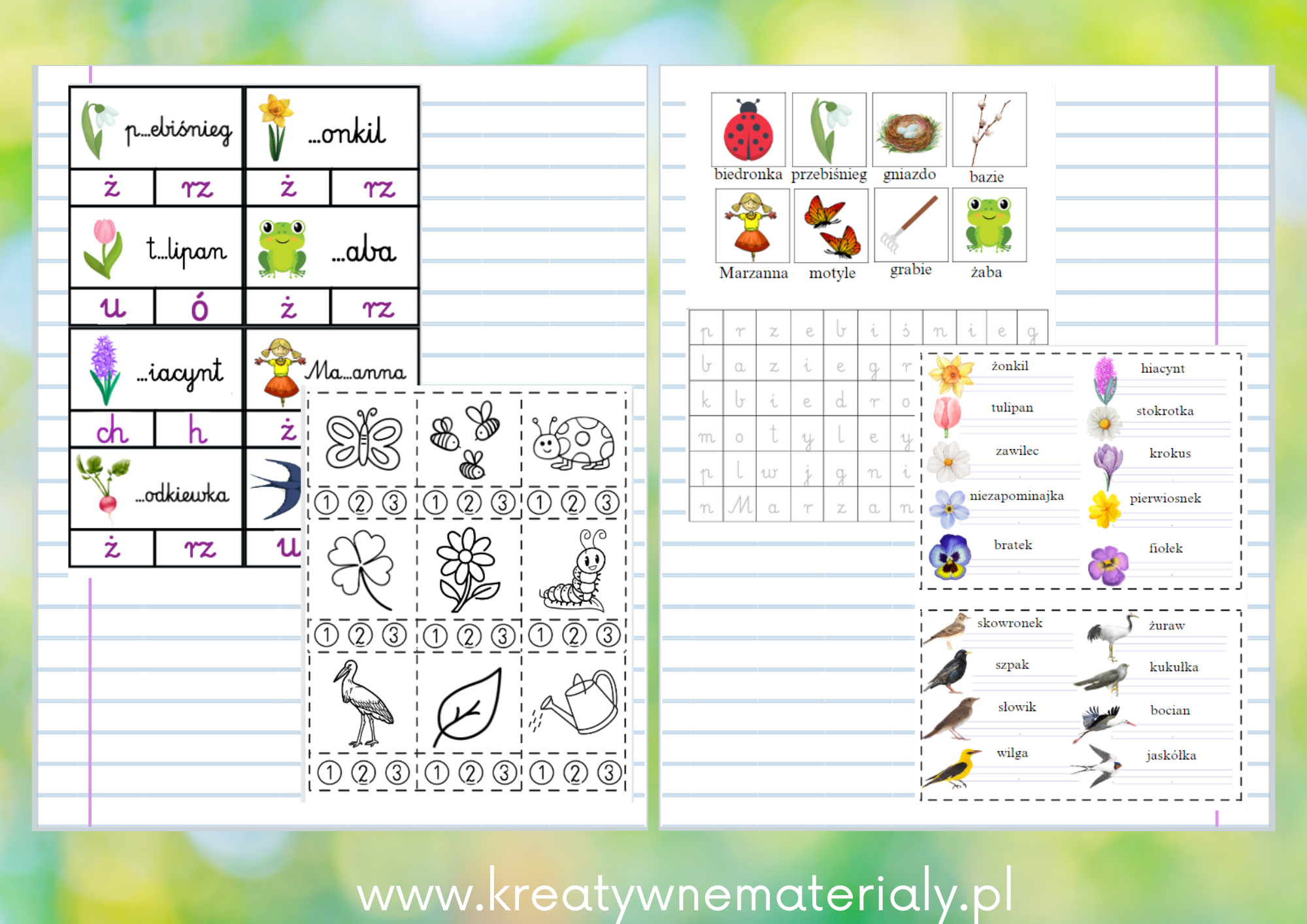 *oznaki wiosny obrazkowe oraz do samodzielnego wpisania zdań w liniaturze,