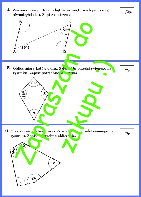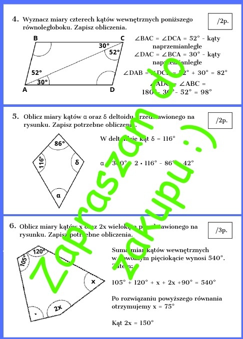Własności wielokątów oraz kąty w wielokątach - kartkówka lub karta pracy z rozwiązaniem
