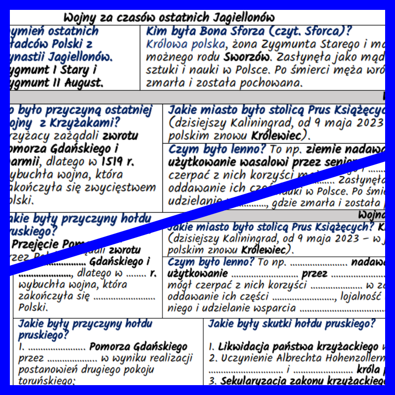 Notatki w formie pytań i odpowiedzi do zagadnienia pt. Wojny za czasów ostatnich Jagiellonów, przygotowane dla klasy 6 według podstawy programowej nauczania historii w szkole podstawowej (Podstawa programowa – Historia – Szkoła podstawowa IV-VIII) oraz karta pracy zawierająca luki w treści wymagające uzupełnienia ustnego lub pisemnego.