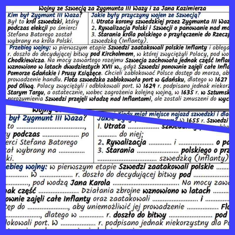 Notatki w formie pytań i odpowiedzi do grupy zagadnień pt. Wojny ze Szwecją za Zygmunta III Wazy i za Jana Kazimierza, przygotowane dla klasy 6 według podstawy programowej nauczania historii w szkole podstawowej (Podstawa programowa – Historia – Szkoła podstawowa IV-VIII) oraz karta pracy zawierająca luki w treści wymagające uzupełnienia ustnego lub pisemnego.
