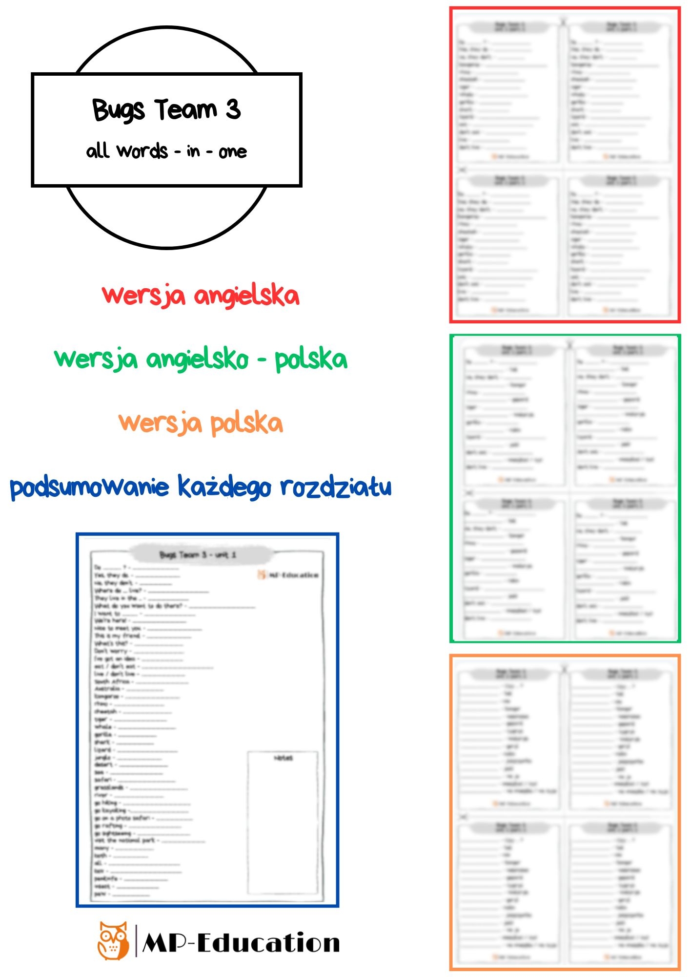 70 stron gotowych wklejek ze słownictwem do podręcznika Bugs Team 3 do wszystkich rozdziałów.