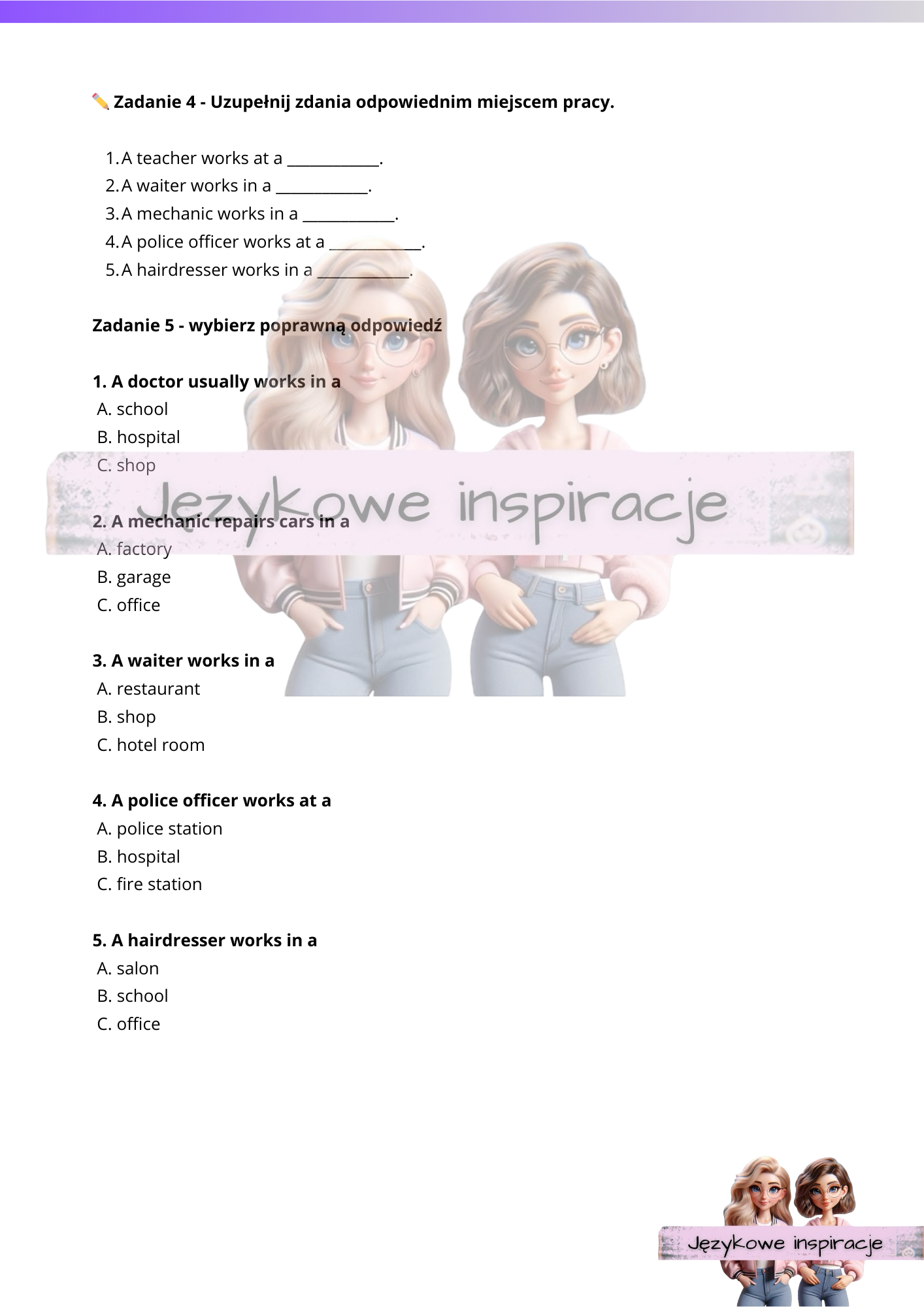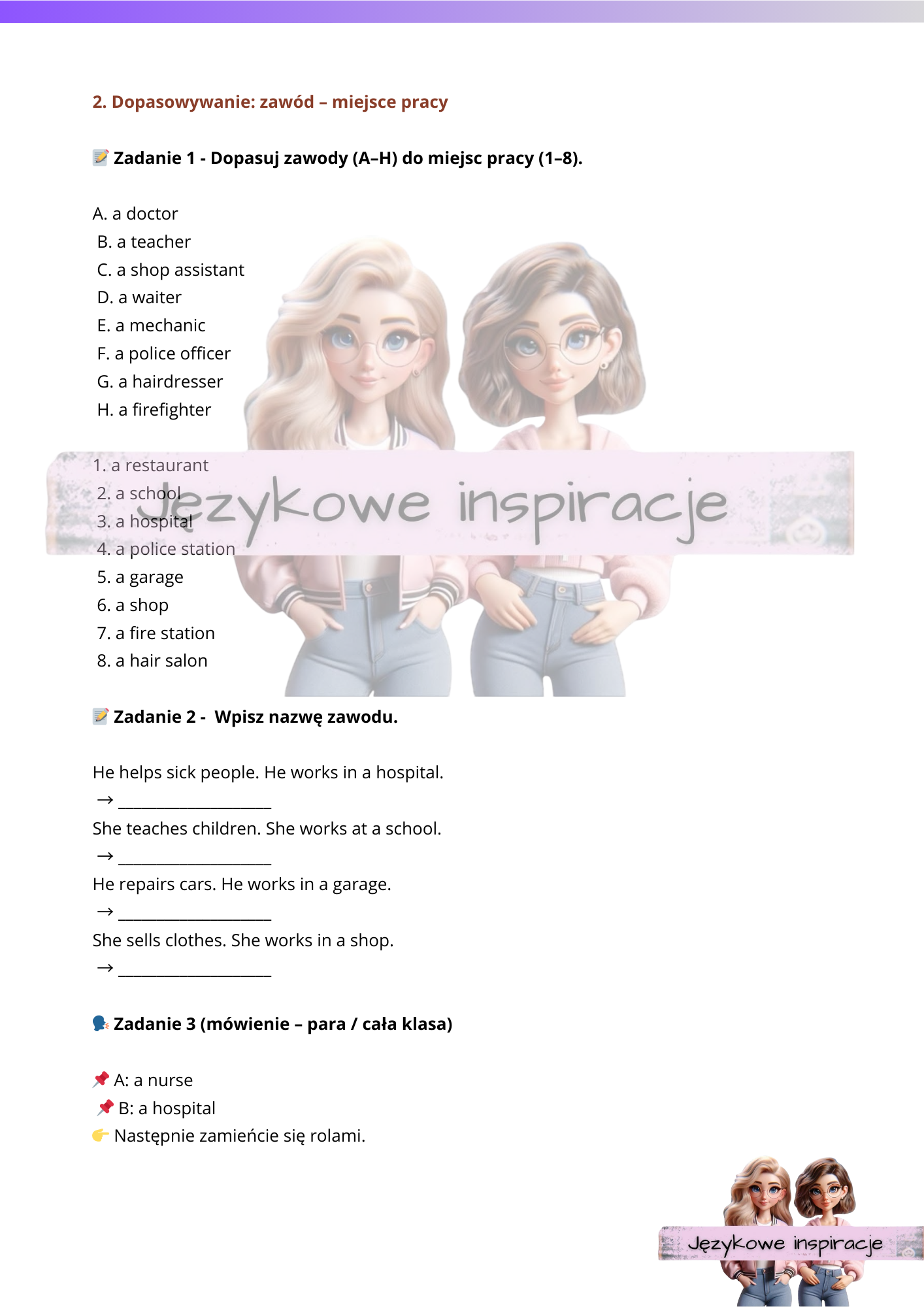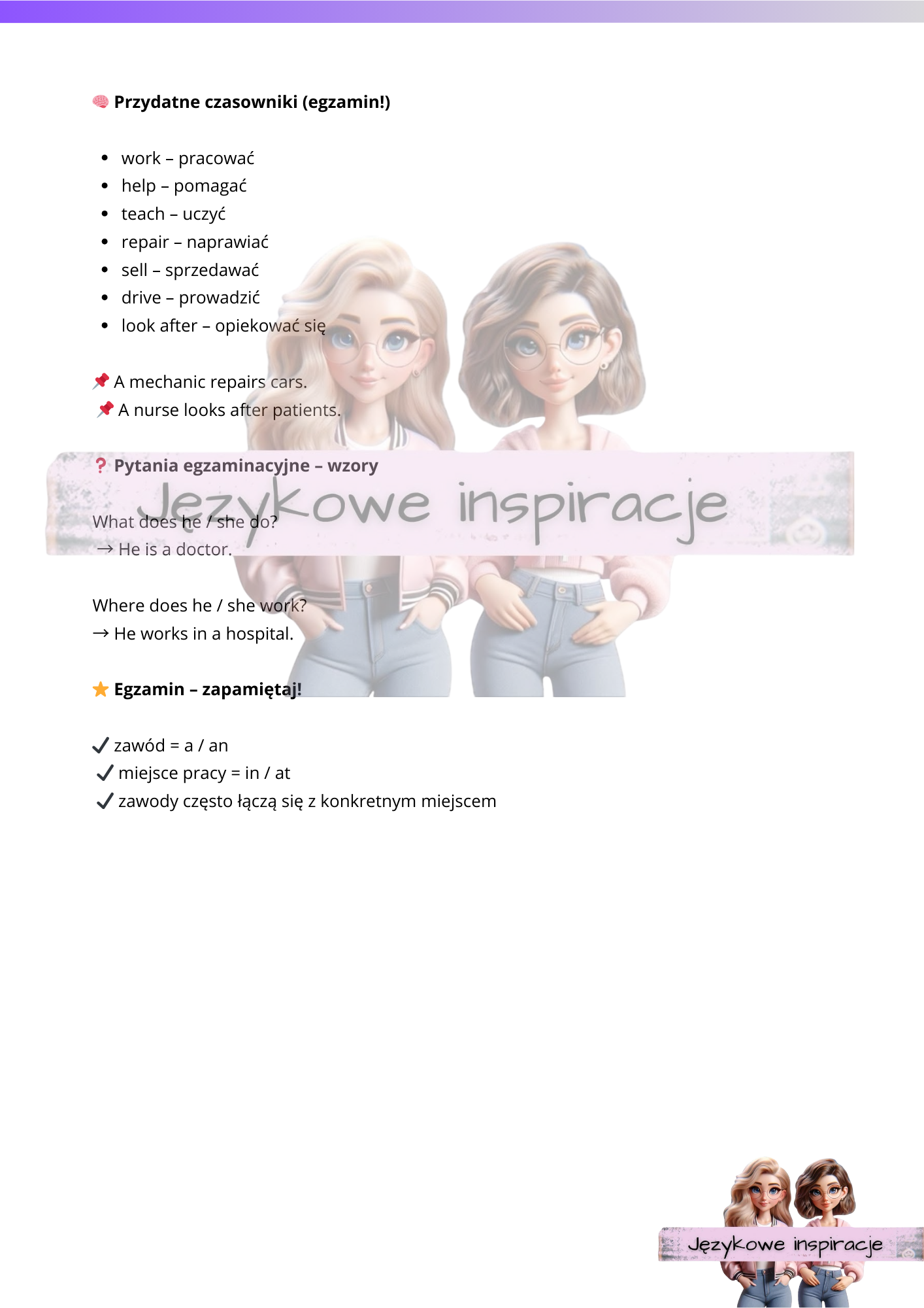 💼📚 WORK E8 – cały dział PRACA ogarnięty pod egzamin ósmoklasisty! 📚💼 Co znajdziesz w środku? 💼 Lekcja 1 – Zawody i miejsca pracy jobs & workplaces – kluczowe słownictwo dopasowywanie: zawód – miejsce pracy zadania egzaminacyjne (multiple choice) uzupełnianie zdań słownictwem speaking: What does he/she do? szybka powtórka na koniec 🛠️ Lekcja 2 – Obowiązki zawodowe duties & responsibilities opisy stanowisk pracy zadania egzaminacyjne (matching, multiple choice) gap fills w opisach pracy ćwiczenie komunikacyjne: What does a … do? mini checklista egzaminacyjna 👔 Lekcja 3 – Umiejętności i cechy pracownika przymiotniki opisujące pracownika skills – umiejętności twarde i miękkie dopasowywanie cech do zawodów zadania w formacie egzaminu krótkie wypowiedzi ustne bank słówek do powtórki 📄 Lekcja 4 – Oferty pracy i ogłoszenia słownictwo z job ads analiza krótkich ofert pracy dobieranie nagłówków do tekstów True/False multiple choice – reading strategie egzaminacyjne do czytania 🗣️ Lekcja 5 – Rozmowa o pracę i reagowanie językowe typowe pytania z job interview przydatne odpowiedzi i reakcje zadania z reagowania językowego jak na egzaminie dialogi sterowane zadanie ustne: mini job interview podręczna „ściąga” z wyrażeń ✉️ Lekcja 6 – Plany zawodowe i przyszła praca mówienie o planach na przyszłość would like to / want to / be going to zadania gramatyczno-leksykalne speaking: My dream job krótka wypowiedź pisemna jak na egzaminie kryteria oceniania – na co zwrócić uwagę 📝 Lekcja 7 – Powtórzenie działu PRACA (mini egzamin) leksyka + gramatyka reagowanie językowe reading wypowiedź pisemna klucz odpowiedzi i samoocena 👩‍🏫 Dla nauczycieli: gotowe lekcje, zadania w formacie egzaminu, speaking + writing + strategie. 👨‍🎓 Dla uczniów: cała PRACA w jednym miejscu, realne zadania jak z arkusza, dużo mówienia i pisania.