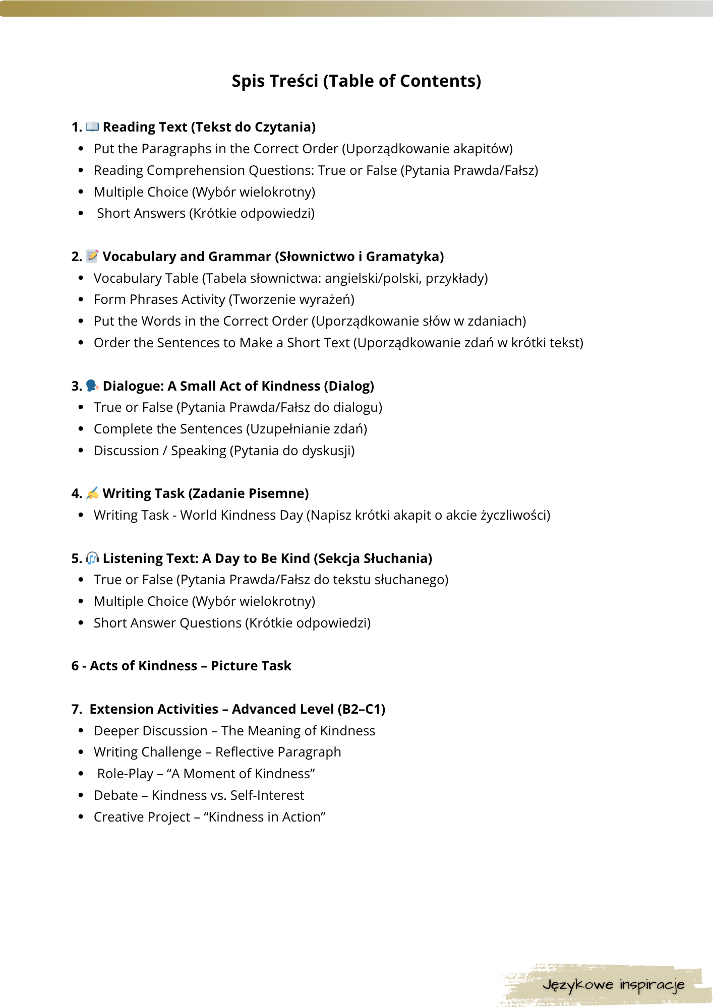 Ten materiał to gotowa lekcja, która idealnie sprawdzi się w okolicach World Kindness Day, ale również jako wartościowy dodatek do zajęć rozwijających empatię i język!