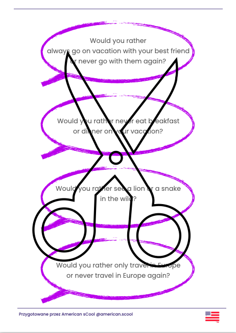 20 pytań zaczynających się od 'Would you rather...' związanych z wakacjami. Idealne na rozgrzewkę/ice breaker po powrocie do szkoły we wrześniu.