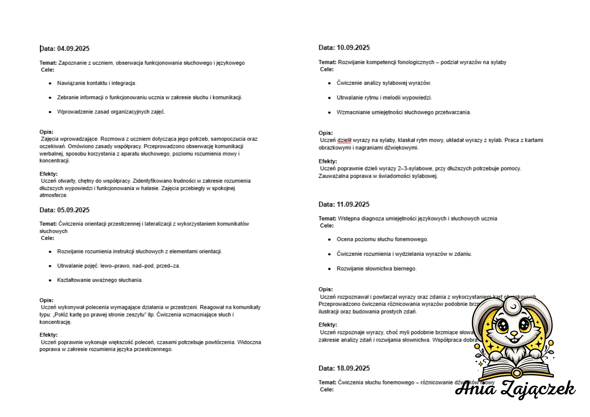 Każdy wpis zawiera: datę, temat, cele, opis, efekty
