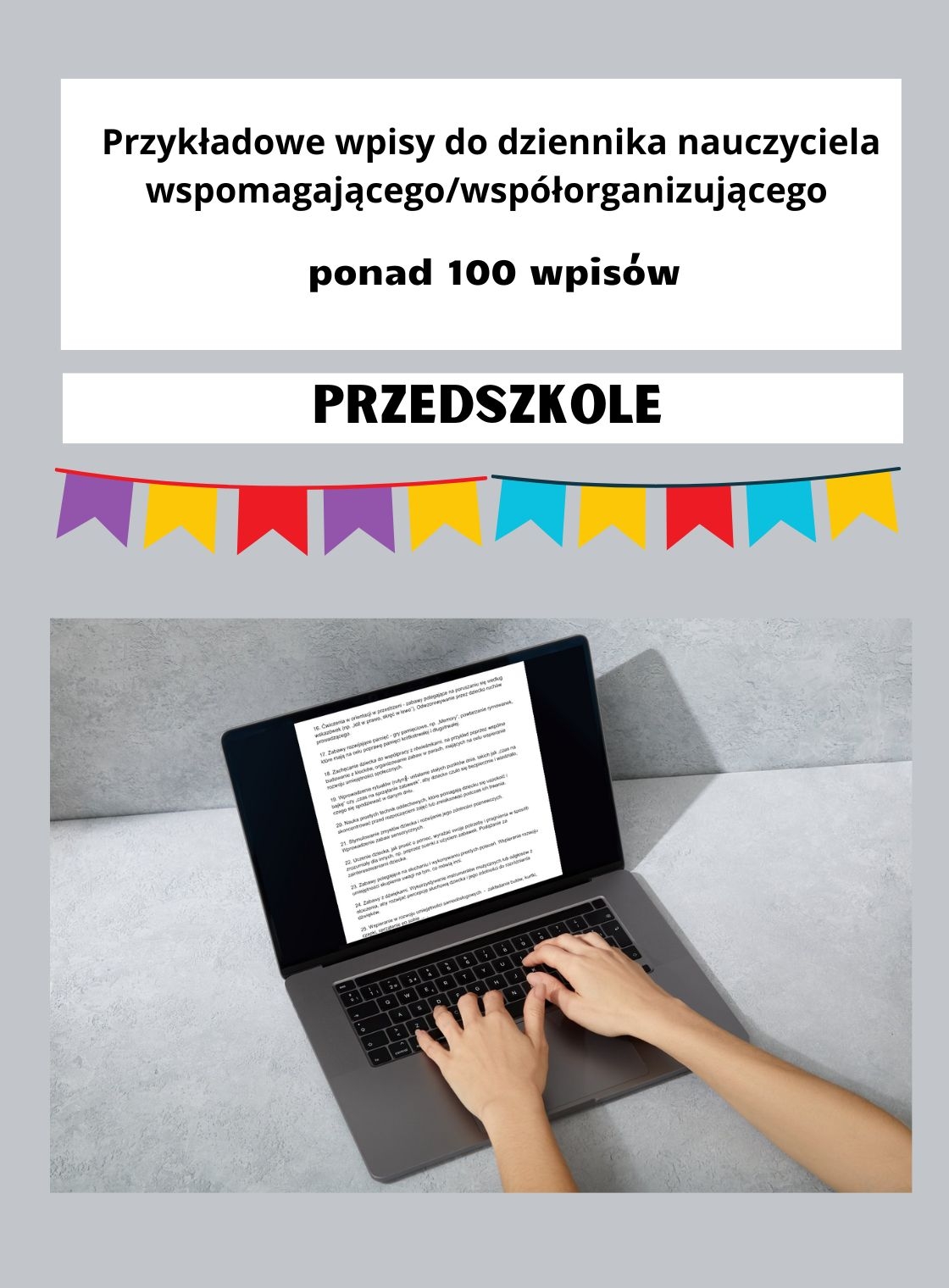 Dokument zawiera 112 wpisów do dziennika nauczyciela wspomagającego/ współorganizującego kształcenie w przedszkolu. Wpisy są inspiracją, propozycją do indywidualnego wykorzystana. Wpisy do dziennika muszą odzwierciedlać faktyczną pracę z dzieckiem.