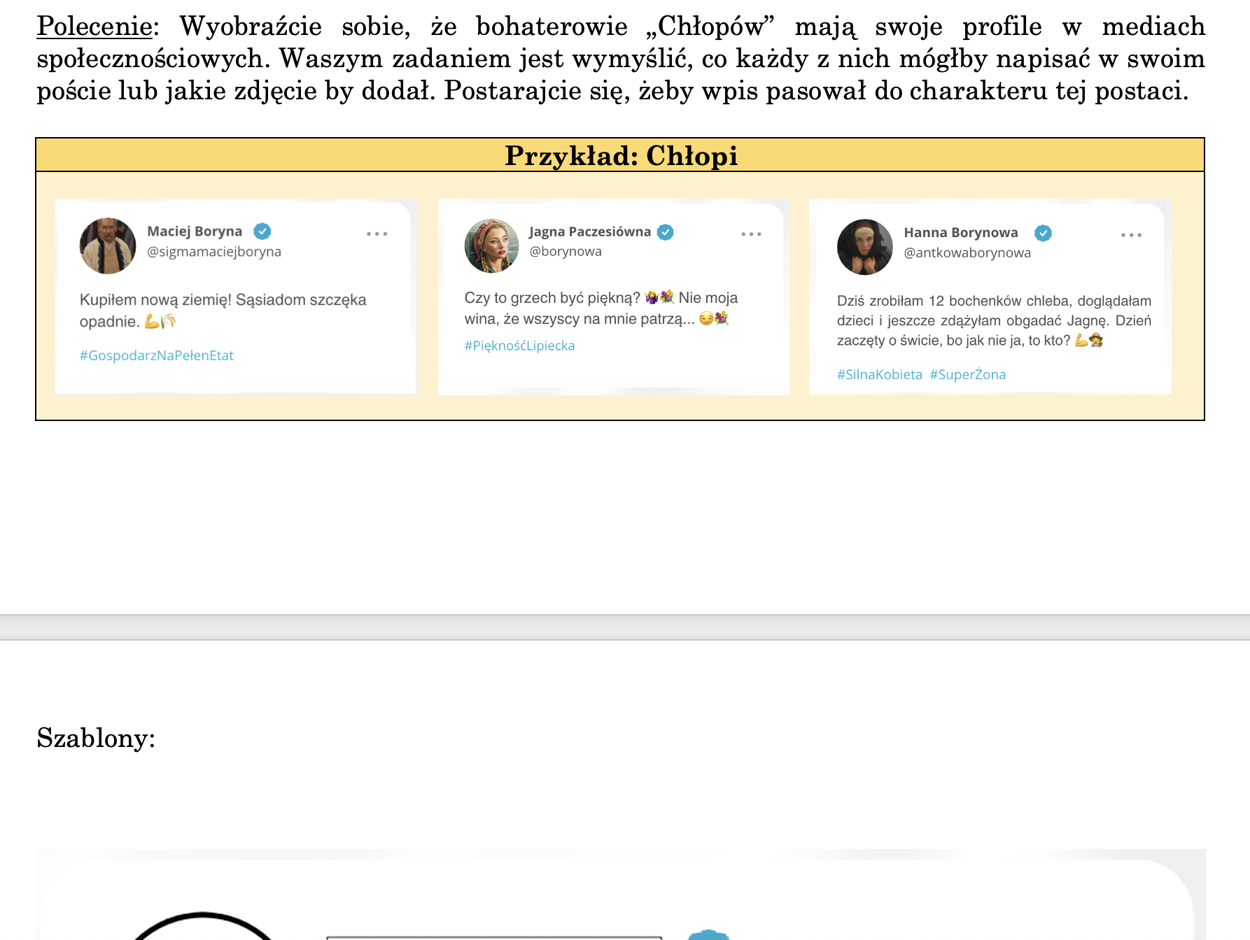 Zaskakująco nowoczesny i angażujący materiał, dzięki któremu uczniowie przenoszą bohaterów literackich do świata mediów społecznościowych! Tworzą ich profile, posty, komentarze i hashtagi, ucząc się przy tym analizy postaci, relacji i emocji w zupełnie nowy sposób.