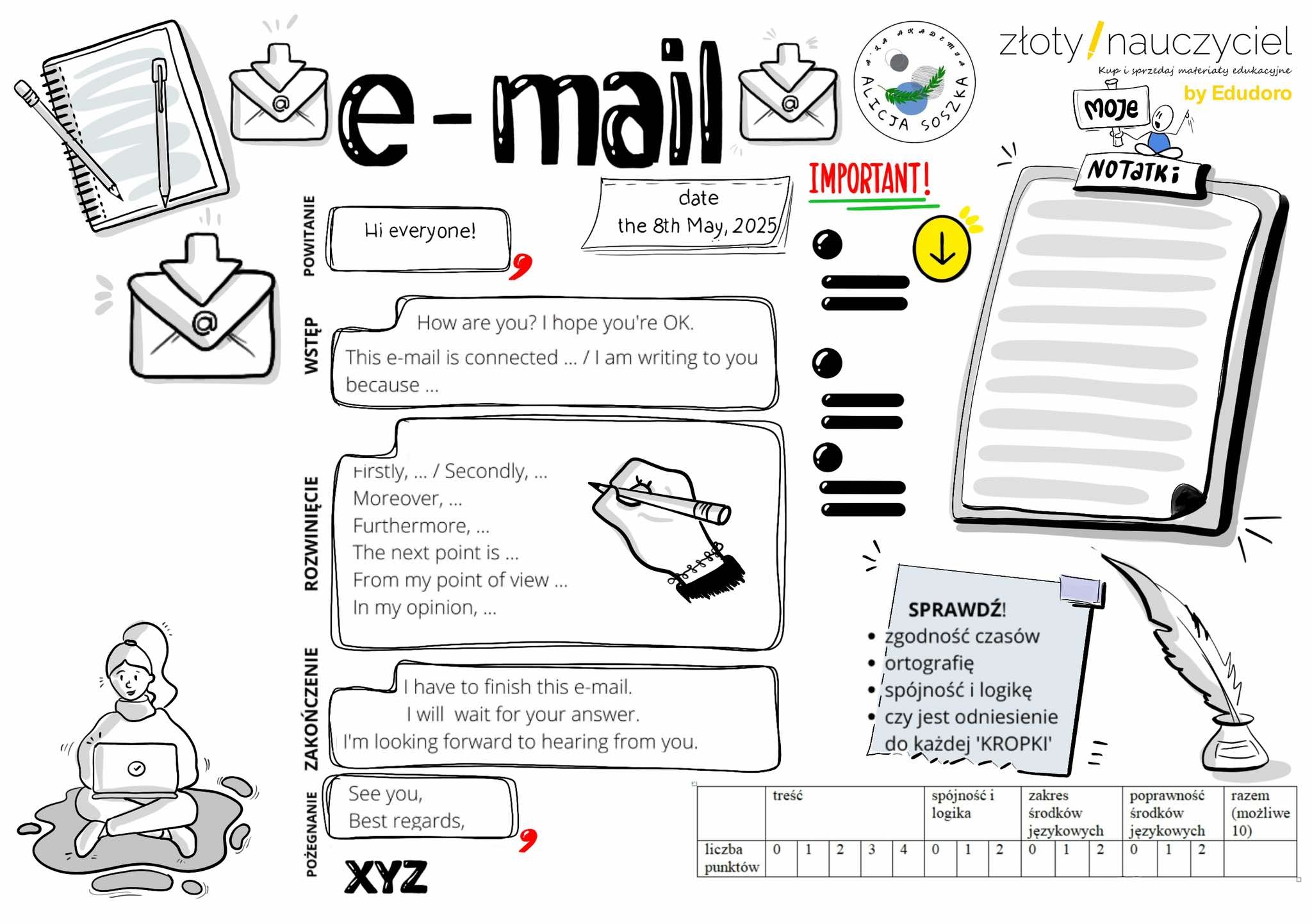Ten materiał to kompleksowy zestaw zasad, przykładów, kryteriów oceniania i ćwiczeń, który wspiera uczniów w tworzeniu wypowiedzi pisemnych w języku angielskim. Zawiera przejrzyste instrukcje, checklisty, tabele punktacyjne oraz zestawy „kropek” — czyli poleceń do rozwinięcia w różnych formach tekstu. Całość została opracowana w stylu wizualnych notatek z humorem i dbałością o szczegóły.
