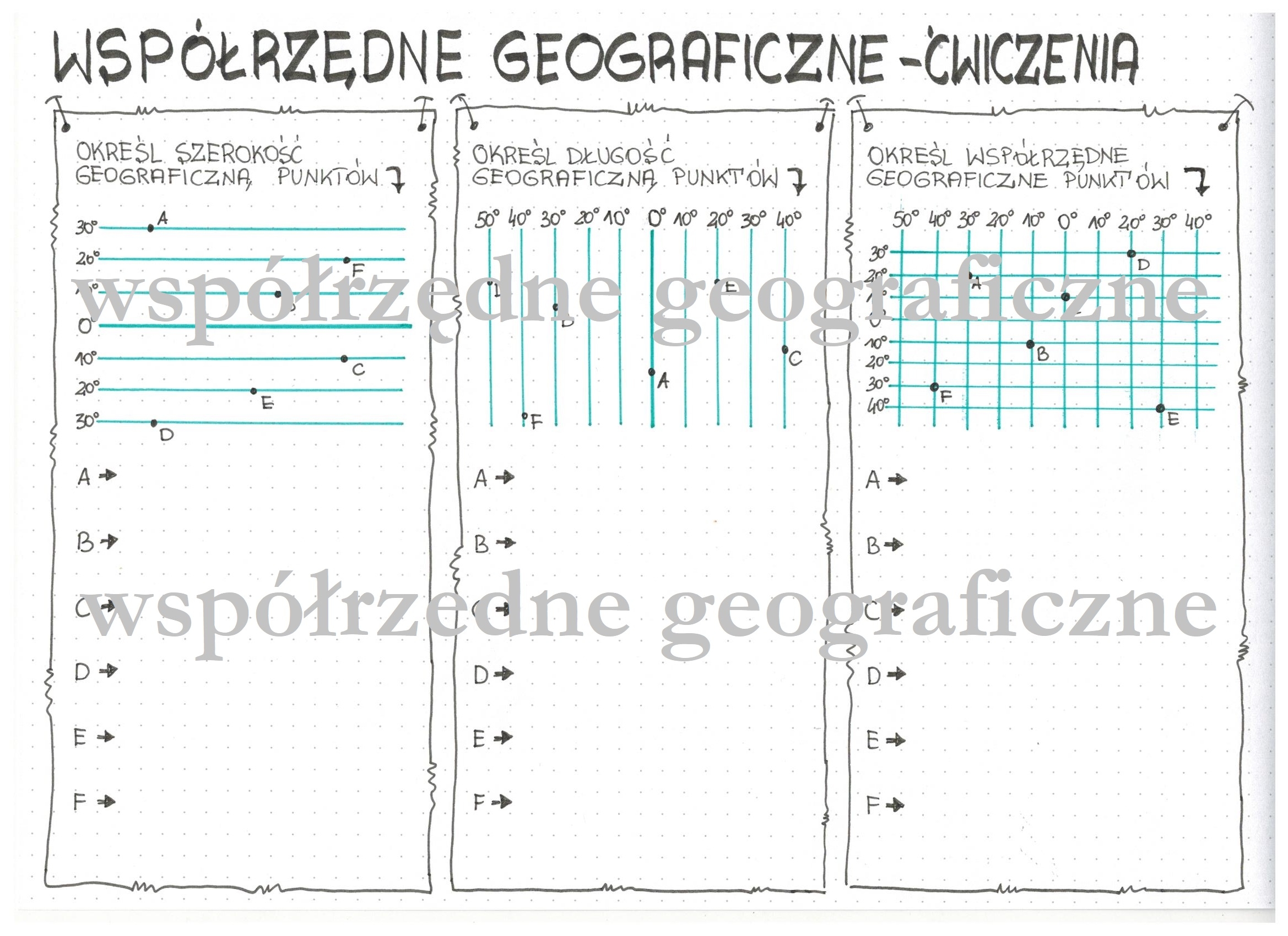 Współrzędne geograficzne - ćwiczenia Ćwiczenia utrwalające określanie współrzędnych geograficznych, które można wykorzystać zarówno przy wprowadzeniu tematu w klasie 5 jak i powtórkę w klasie 6 oraz w pozostałych klasach szkoły podstawowej lub ponadpodstawowej. Plik zakupiony jest oczywiście bez szarych napisów.