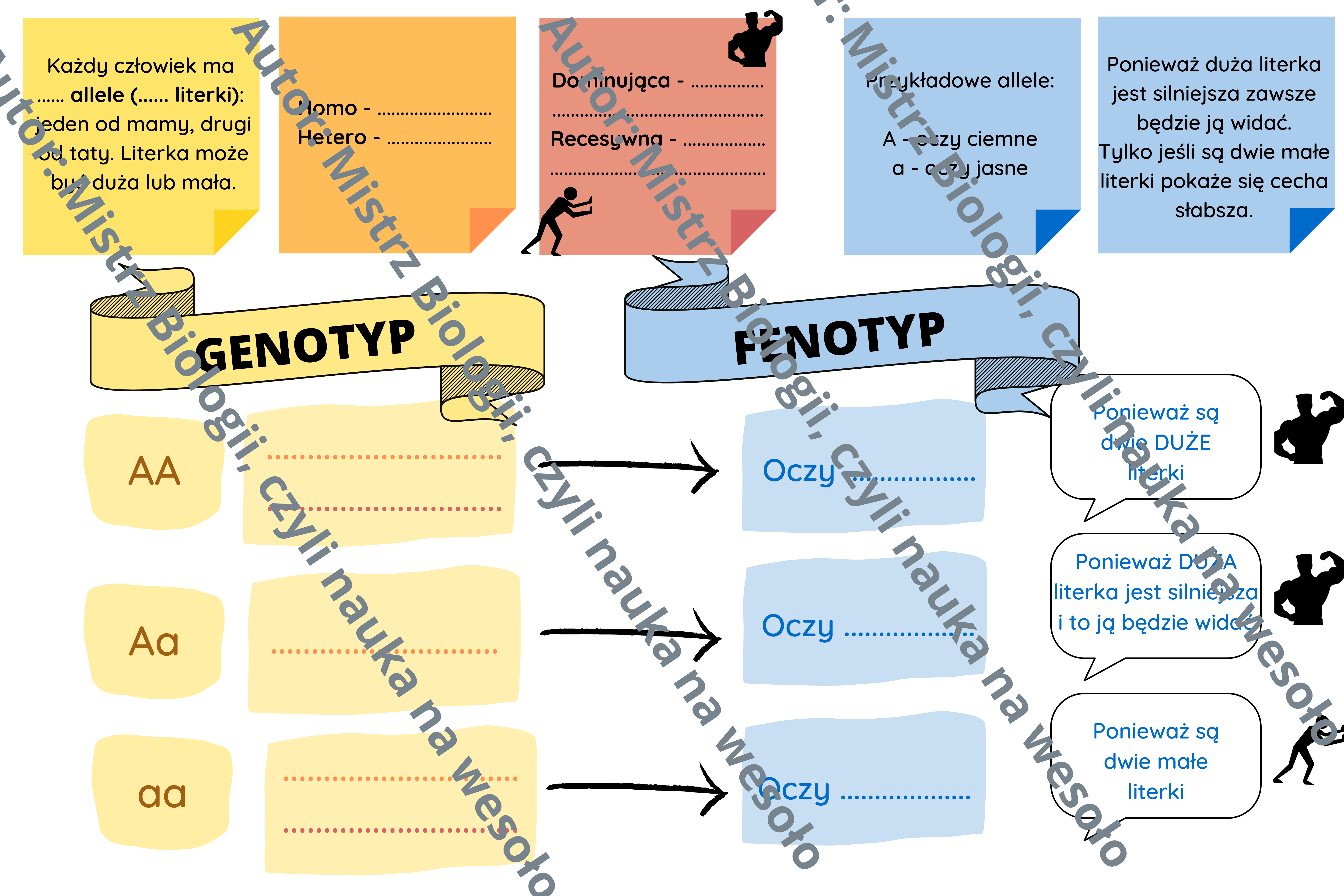 Ta grafika pomoże uczniom zrozumieć słownictwo związane z dziedziczeniem cech oraz ułatwi zrozumienie poleceń do zadań. Idealna do klasy 8, ale w liceum przy powtórzeniu też może się przydać. W tej wersji są luki, które uczniowie podczas lekcji uzupełniają (gdy nauczyciel wyjaśnia poszczególne zagadnienia)