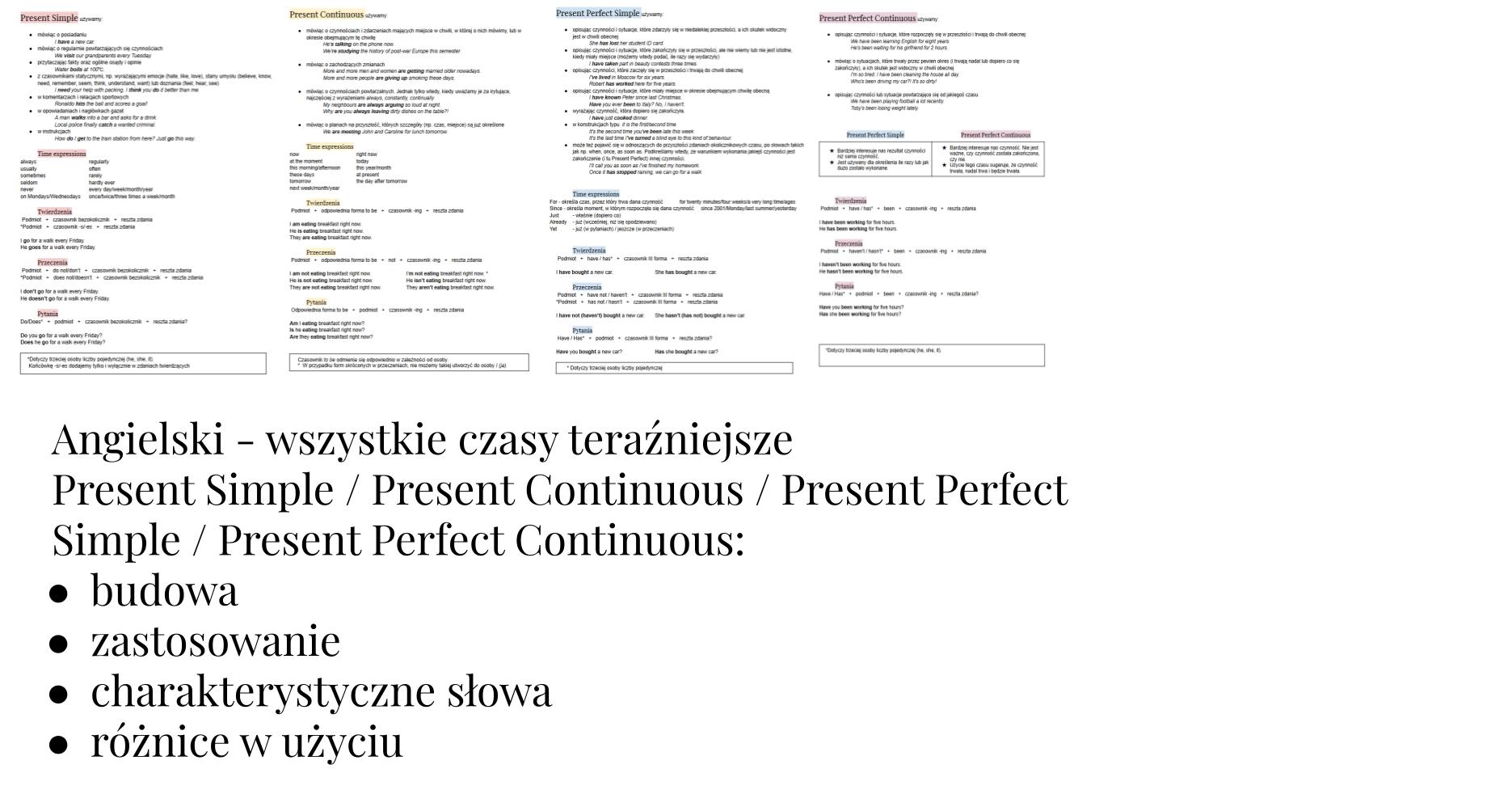 Każdy czas jest szczegółowy opisany z samymi najważniejszymi informacji, tj. zastosowanie, budowa, określniki czasu, różnica w użyciu Present Perfect Simple a Continuous.