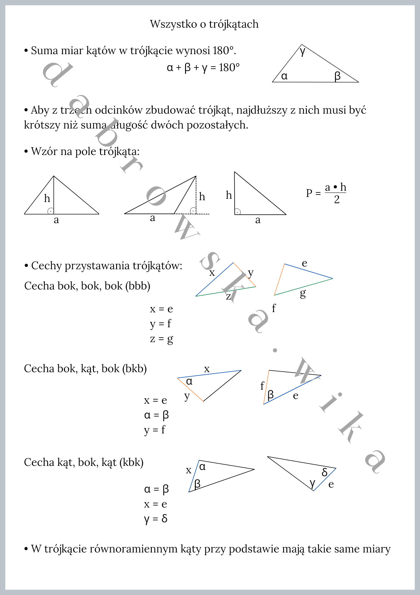 Materiał zawiera notatkę dotyczącą podstawowych własności trójkątów. Zawarto w niej: