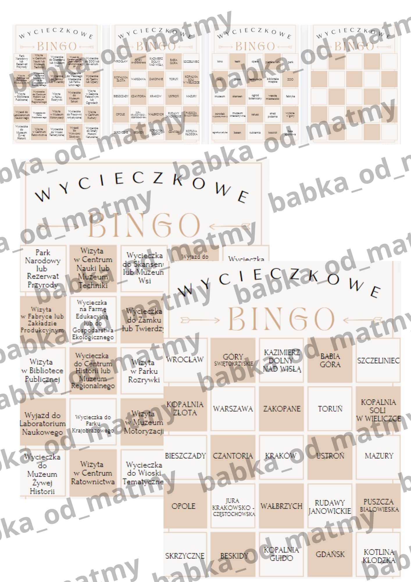 WYCIECZKOWEGO BINGO to zabawa dla całej klasy, polegająca na wspólnym skreślaniu pól na planszy z miejscami, które uczniowie już odwiedzili na wycieczkach. Plansza zawiera różnorodne miejsca, takie jak muzea, parki, centra nauki czy atrakcje przyrodnicze. Zadaniem klasy jest skreślenie jednej linii (poziomej, pionowej lub na ukos) albo całej planszy, w zależności od ustalonego celu.