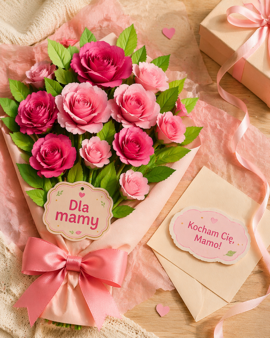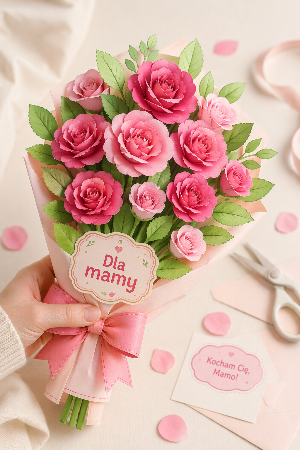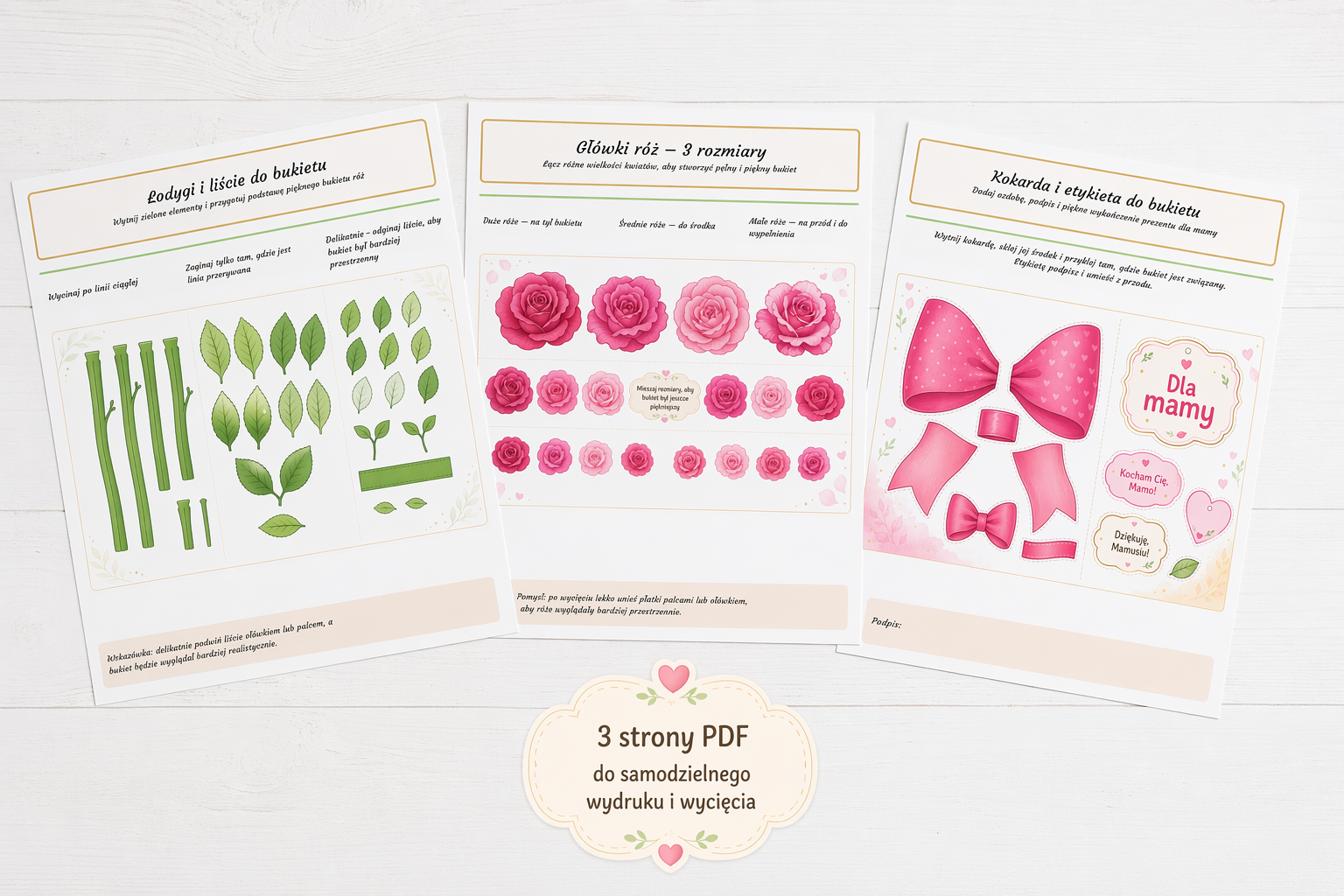 Całość przygotowałam tak, żeby składanie było przyjemne i intuicyjne 😊 Na pierwszej stronie umieściłam zielone elementy do zbudowania podstawy bukietu, na drugiej główki róż w różnych wielkościach, a na trzeciej ozdobną kokardę i etykiety z napisami dla mamy. Dzięki temu można stworzyć bukiet przestrzenny, delikatny i bardzo dekoracyjny.