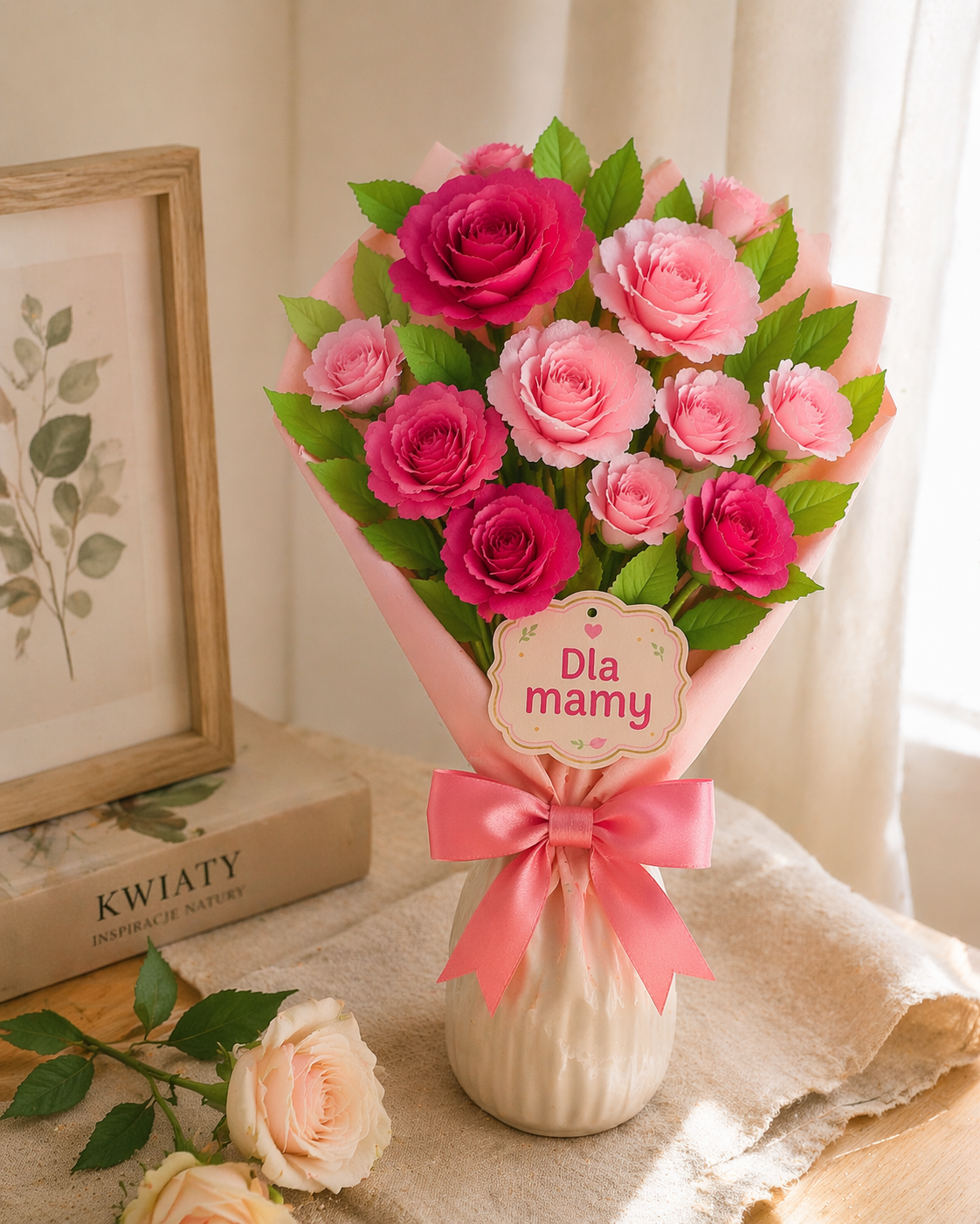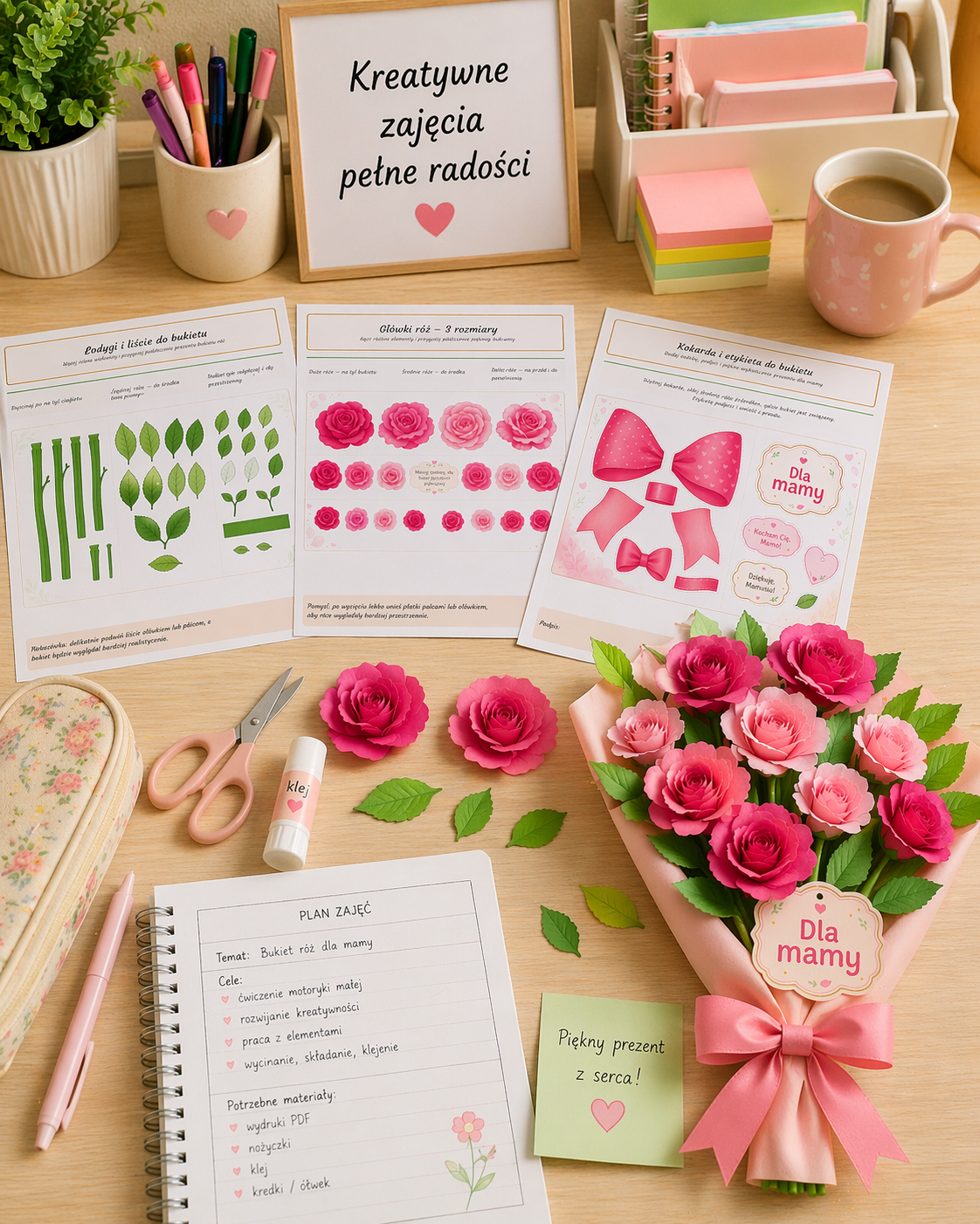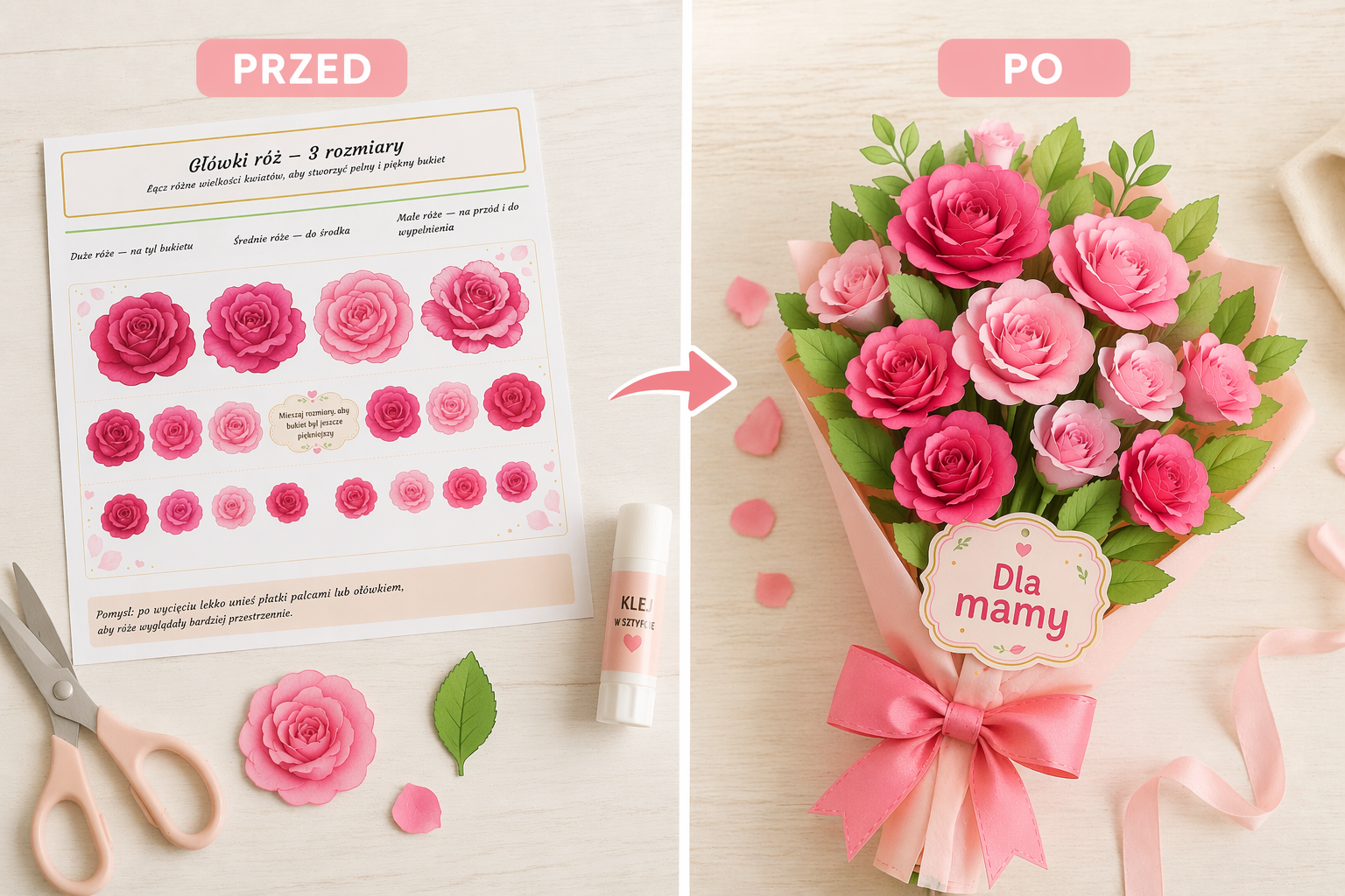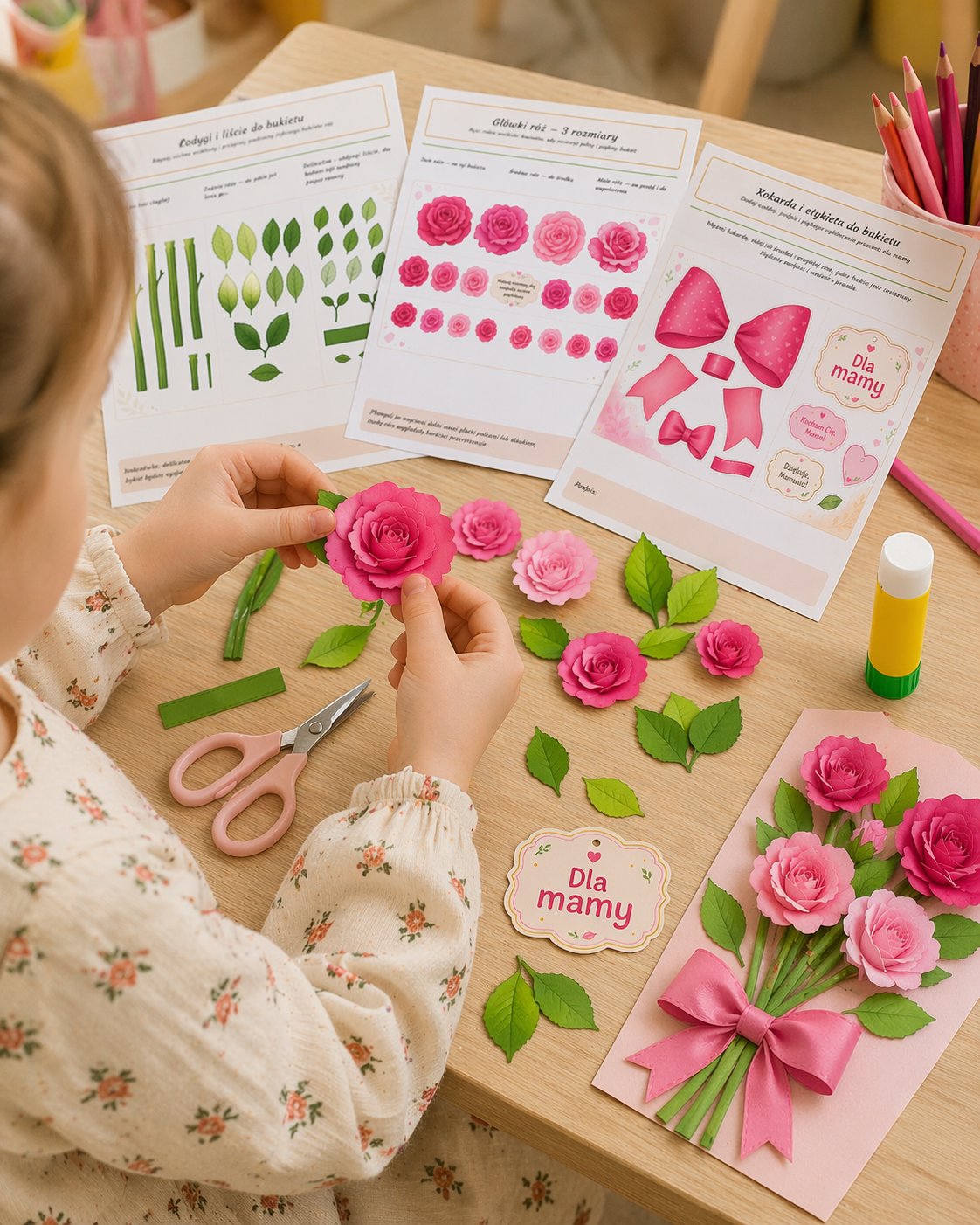 Stworzyłam tę wycinankę z myślą o dzieciach, które chcą własnoręcznie przygotować piękny, wyjątkowy bukiet róż dla mamy 💖 To kreatywny materiał do wycinania i składania, z którego krok po kroku powstaje uroczy papierowy bukiet — lekki, efektowny i naprawdę robiący wrażenie. W środku znajdują się elementy do stworzenia całej kompozycji: łodygi i liście, róże w 3 rozmiarach oraz kokarda i etykiety do wykończenia prezentu.