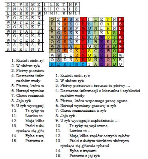 Zapraszam do zakupu wykreślanki dla klasy VI, którą można wykorzystać na biologii jako podsumowanie lekcji o rybach. Łamigłówka zawiera hasła dotyczące budowy, czynności życiowych, przedstawicieli oraz znaczenia ryb. Rozwiązaniem wykreślanki jest hasło: Zmiennocieplne kręgowce wodne to ... Plik zawiera również rozwiązaną wykreślankę.