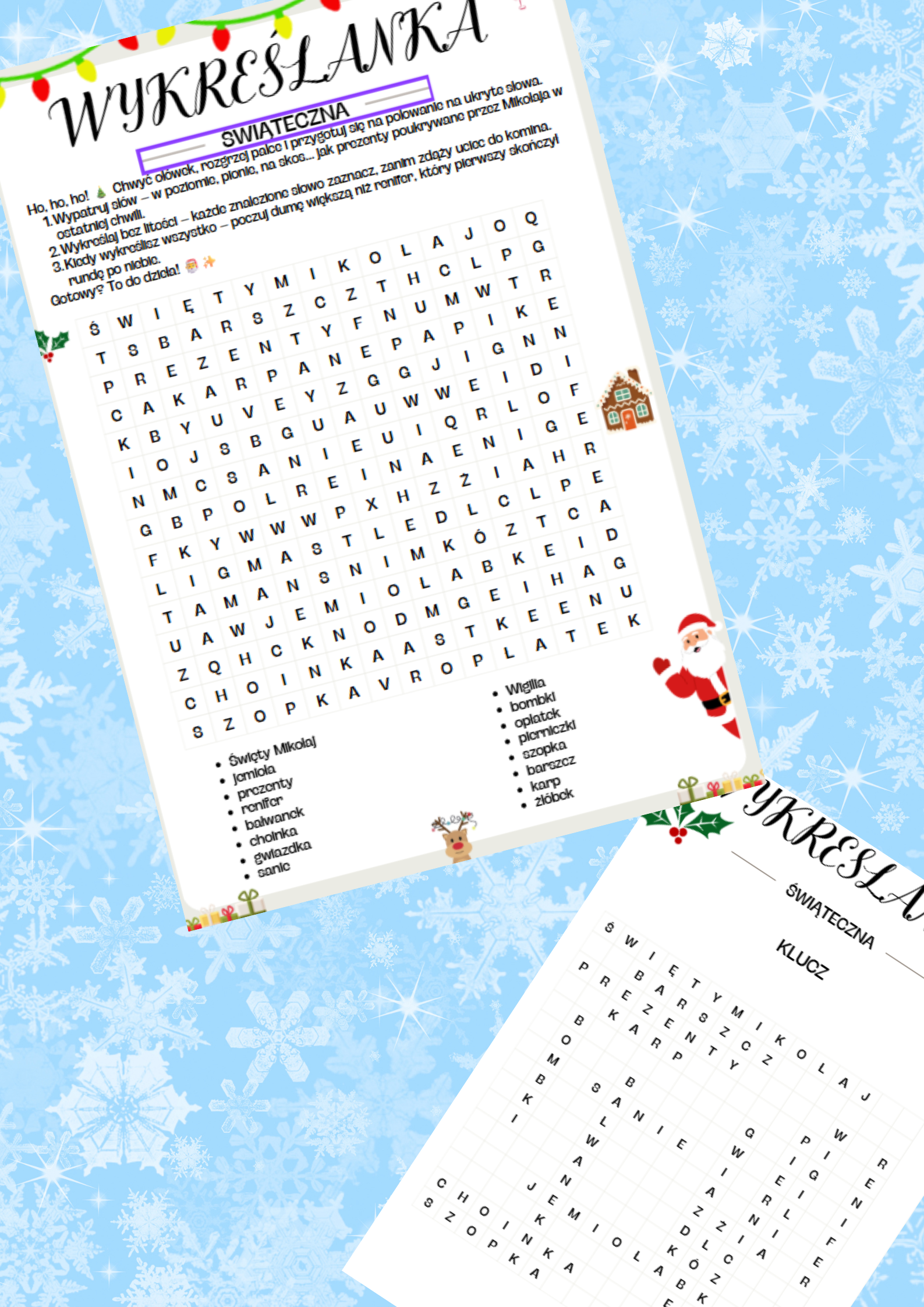 Wykreślanka świąteczna to świetny pomysł na ostatnie lekcje przed Bożym Narodzeniem! Ta prosta, angażująca aktywność sprawdzi się zarówno na języku polskim, rewalidacji, jak i godzinie wychowawczej. Wprowadza świąteczny nastrój, rozwija spostrzegawczość i pozwala uczniom chwilę odetchnąć przy przyjemnym, a jednocześnie wartościowym zadaniu. Idealna jako szybkie ćwiczenie, praca w parach lub wstęp do rozmowy o tradycjach świątecznych.