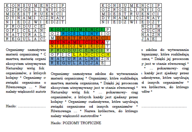 Zapraszam do zakupu wykreślanki z hasłem: Poziomy troficzne, którą można wykorzystać na podsumowanie lekcji biologii w klasie 8 "Zależności pokarmowe". Pytania są skorelowane z podręcznikiem z serii "Puls życia" Wydawnictwa Nowa Era. Po wykreśleniu pojęć, litery czytane poziomo utworzą hasło. Plik zawiera również rozwiązanie.