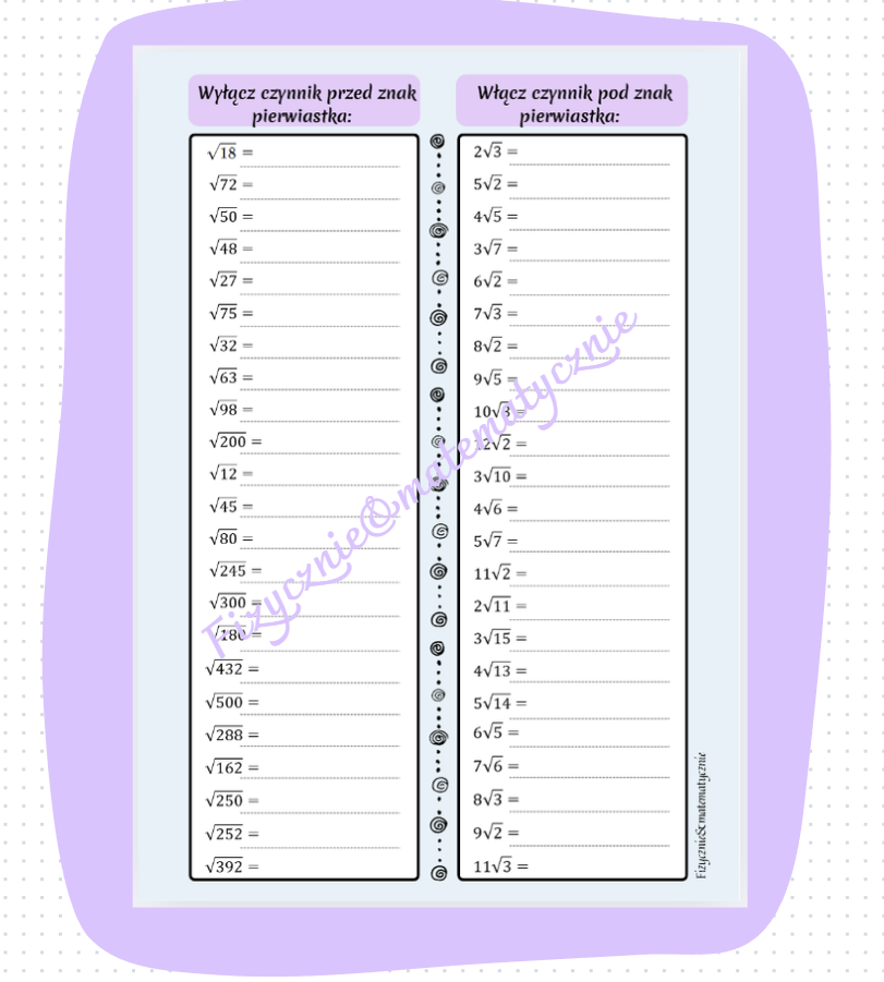 Materiał zawiera zadania sprawdzające umiejętność wyłączanie czynnika przed znak pierwiastka oraz włączanie czynnika pod znak pierwiastka. Może być wykorzystany podczas lekcji na zajęciach dodatkowych czy jako samodzielna praca w domu.