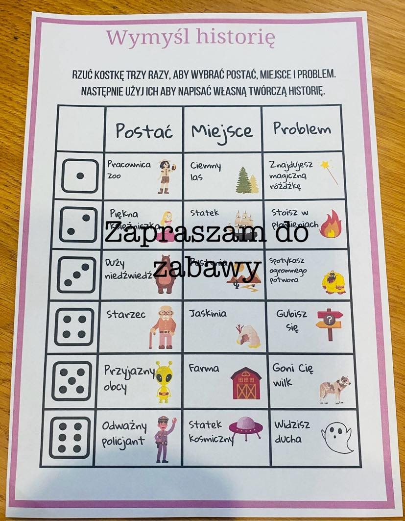 Materiał idealny na terapie indywidualną lub w małych grupach. Narzędzie pedagogiczne i terapeutyczne. Gra polegająca na wymyśleniu historii, opowieści rozwijającej wyobraźnię, zasób słownictwa, myślenie logiczne i przyczynowo skutkowe. Dziecko rzuca trzy razy kostką, aby wybrać postać, miejsce i problem. Następnie wymyśla własna twórczą historię.