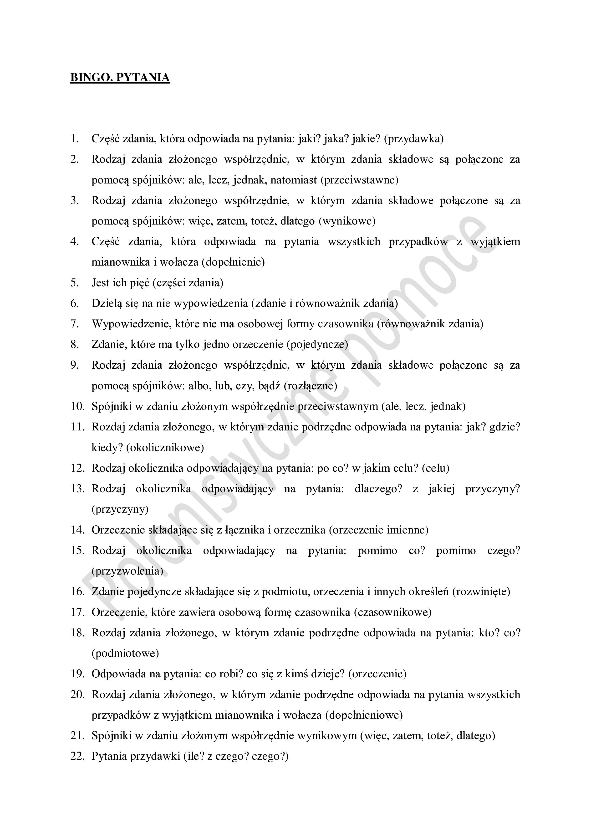Gra zawiera 30 plansz. Przewidziana jest na klasę, która liczy 30 uczniów, ale plansz można wydrukować dowolną ilość, w zależności od potrzeb. Do gry dołączone są pytania. Poszczególne karty rozdawane są uczniom (jedna karta dla jednego ucznia). Nauczyciel czyta pytanie, uczniowie podają prawidłową odpowiedź i szukają jej na swojej karcie do gry w bingo. W momencie znalezienia danej odpowiedzi, zakreślają kwadracik. Wygrywa ta osoba, która zakreśli pierwsza pięć kwadratów w pionie lub w poziomie lub na ukos i krzyknie: BINGO! Nagrodą może być słodka niespodzianka.