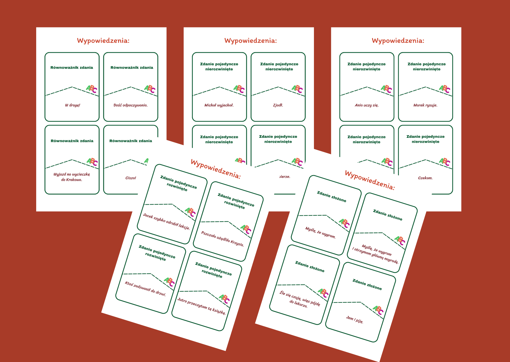 Zestaw 32 fiszek z wypowiedzeniami po 8 sztuk na każdy rodzaj: równoważnik zdania, zdanie pojedyncze nierozwinięte, zdanie pojedyncze rozwinięte, zdania złożone (bez podziału). Po wycięciu fiszek warto je zalaminować, by dłużej posłużyły.