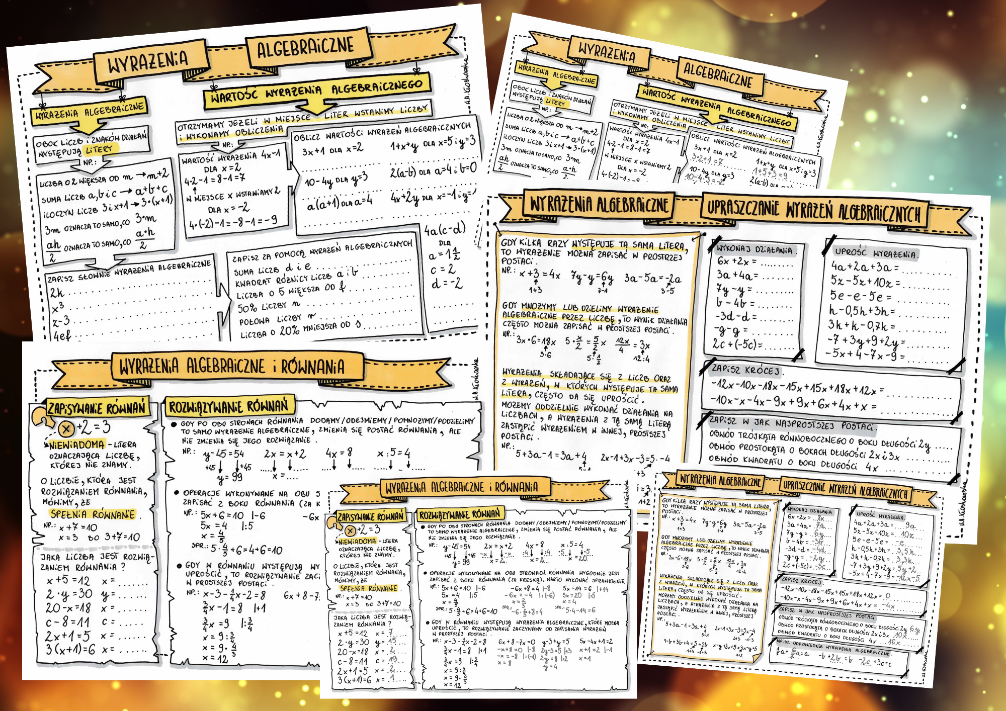 3 karty pracy dla uczniów i 3 karty z odpowiedziami. Matematyka klasa 6 - Wyrażenia algebraiczne i równania: