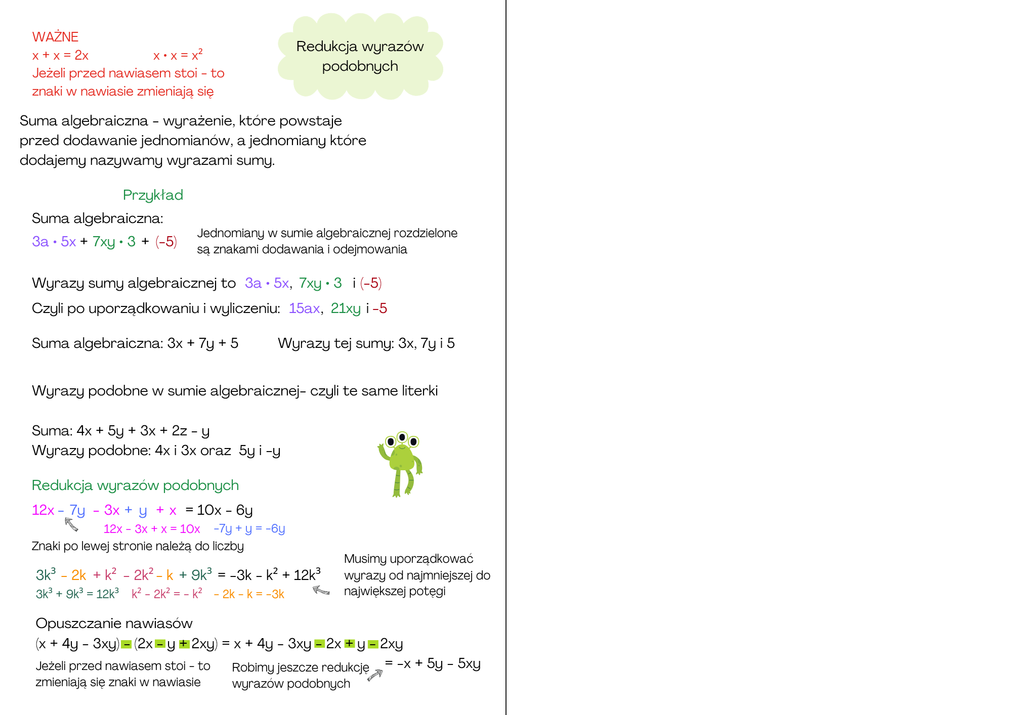 - opuszczanie napisów oraz mnożenie sum algebraicznych wraz z przykładami i zadaniami rozwiązanymi krok po kroku.