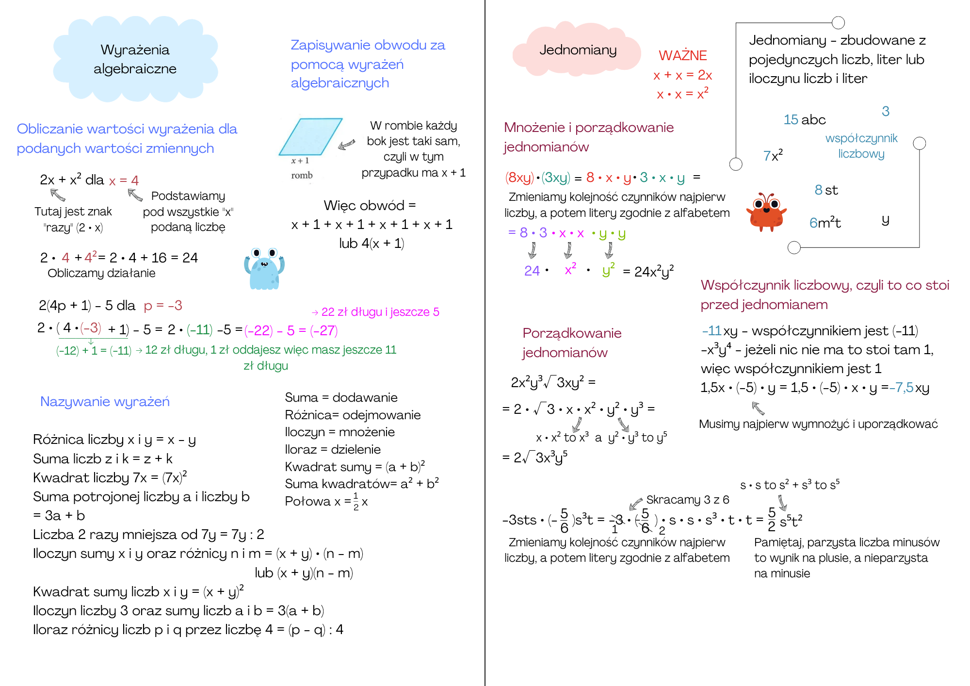 - jednomiany wraz z przykładami i zadaniami rozwiązanymi krok po kroku.