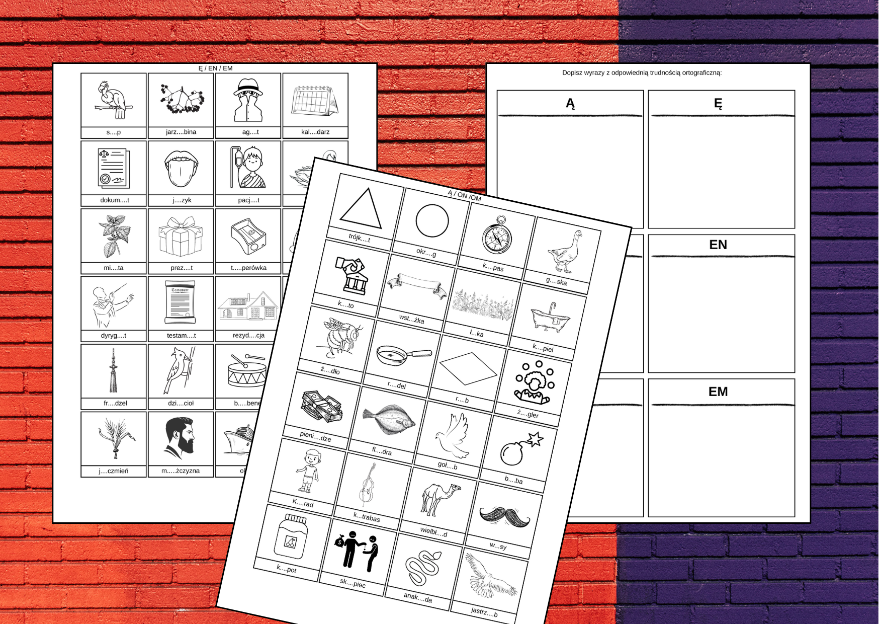 Zestaw 3 kart pracy: na dwóch znajdują się fiszki z grafikami i słowami z trudnością ortograficzną (należy wpisać brakującą literkę). Na jednej karcie pracy puste „tabliczki”, które trzeba odpowiednio uzupełnić na podstawie kart z fiszkami.