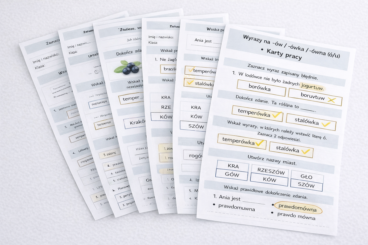 Ten zestaw to gotowe, estetyczne i bardzo angażujące karty pracy w PDF, które pomagają dzieciom ćwiczyć pisownię wyrazów z „ó” wymiennym i niewymiennym w praktyce – poprzez zaznaczanie, uzupełnianie, wybór odpowiedzi, łączenie w pary i zadania z obrazkami 🧠📎