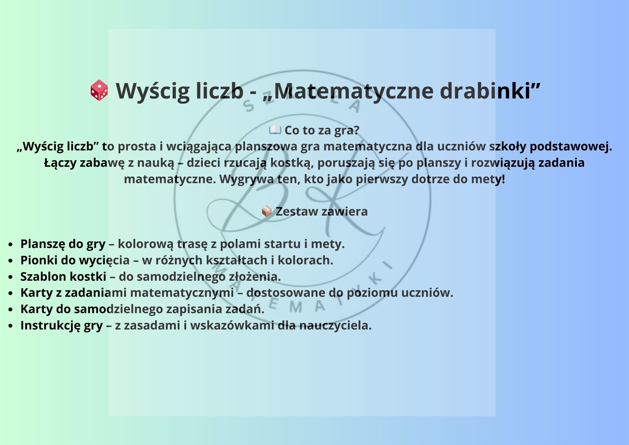 Wyścig liczb to prosta gra planszowa, w której dzieci przesuwają pionki po torze, rozwiązując zadania matematyczne. Celem jest jak najszybsze dotarcie do mety.