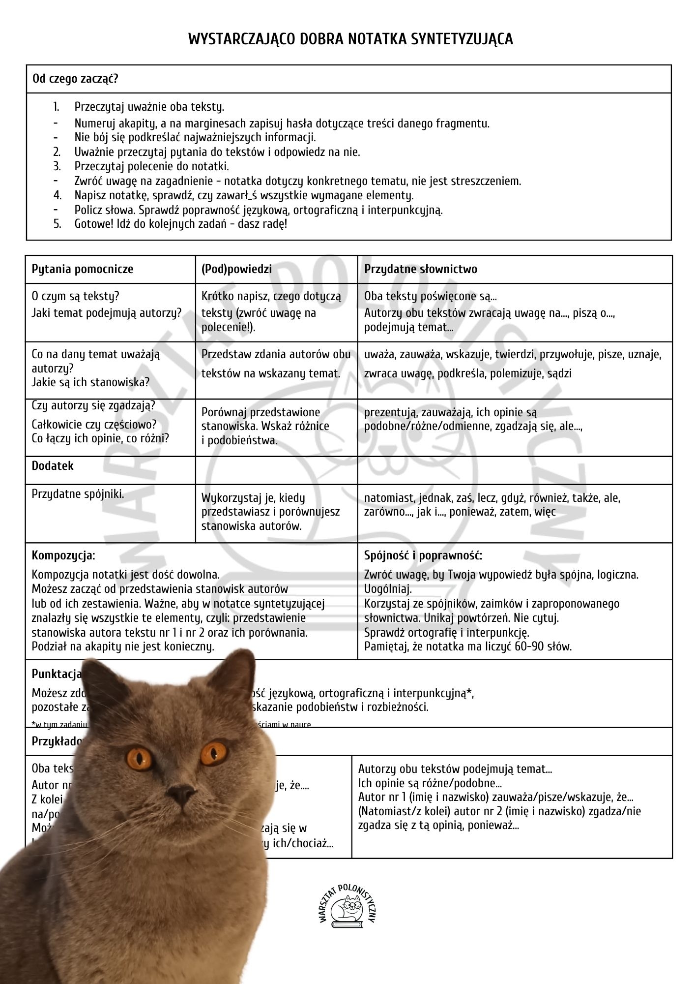 Bardzo pomocny materiał o notatce syntetyzującej, przydatny zarówno do pracy na lekcji, jak i samodzielnej pracy uczniów. Prowadzi kolejne kroki, zawiera pytania pomocnicze i podpowiedzi oraz przydatne słownictwo i schematy.