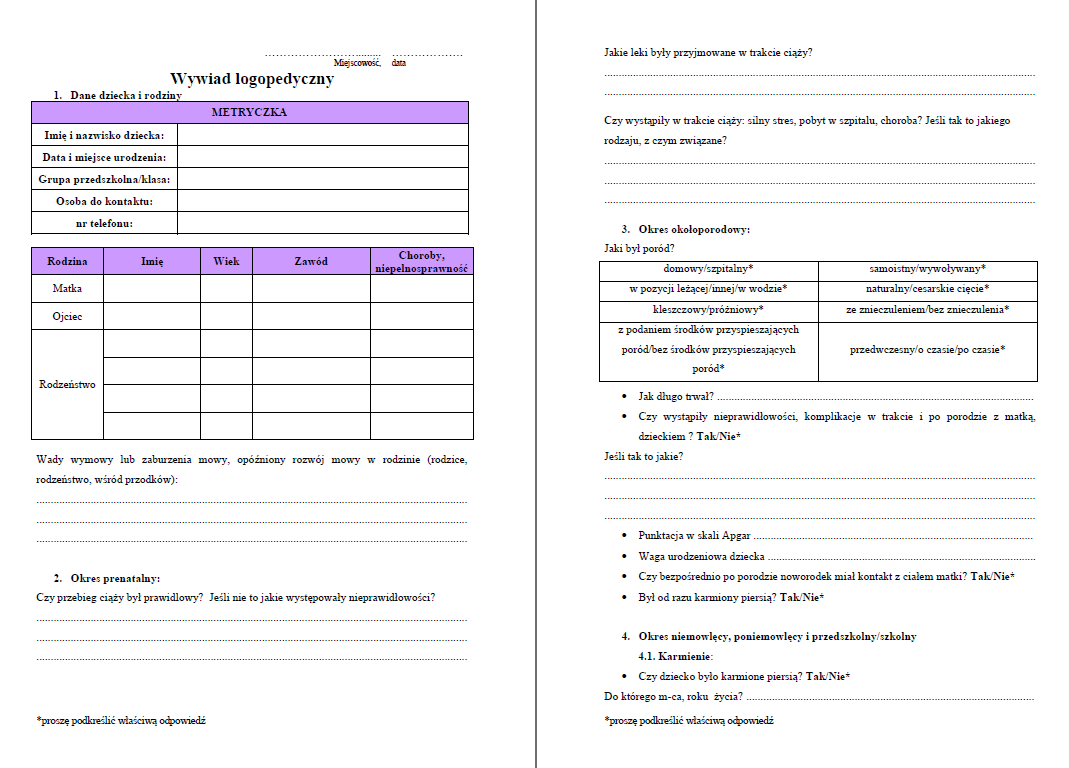 Wywiad ułatwia zebranie pełnej dokumentacji do diagnozy logopedycznej, opinii do poradni psychologiczno-pedagogicznej oraz planowania terapii.