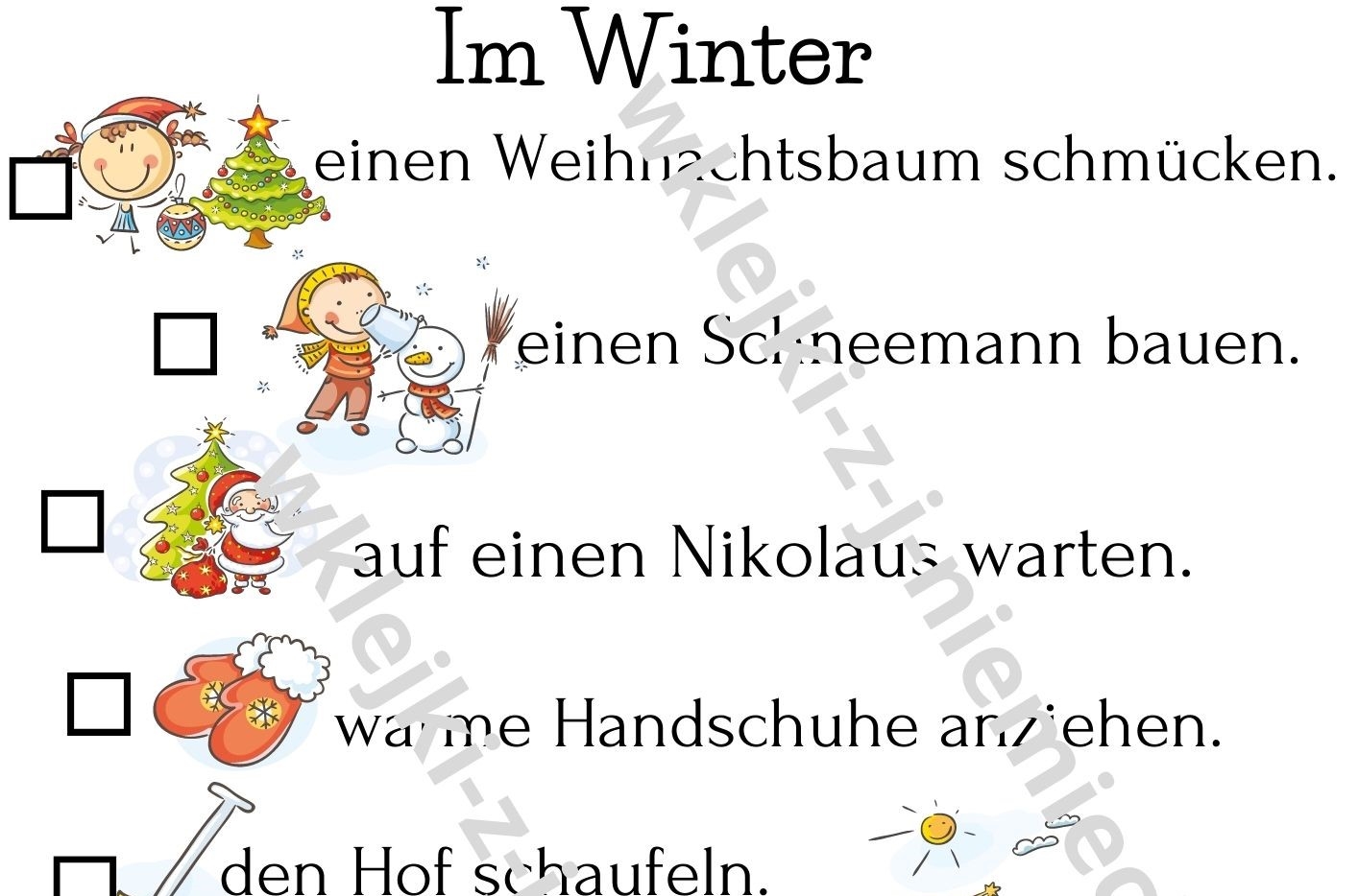 Jak zachęcić dzieci i całe rodziny do aktywności i wspólnej nauki przez zabawę? Wykorzystaj plakat: Wyzwania na zimę w języku niemieckim. W trakcie całej pory roku lub w jednym miesiącu uczniowie wykonują zadania z listy, a później dzielą się swoimi wrażeniami i opowiadają o tym, co udało im się zrobić. Fajna forma ćwiczenia do rozwijania umiejętności pisania krótkich wypowiedzi pisemnych na dany temat - pora roku, święta, sporty zimowe. Polecam jako wklejkę do zeszytu, plakat na lodówkę, wyzwanie dla klasy. Miłej zabawy.