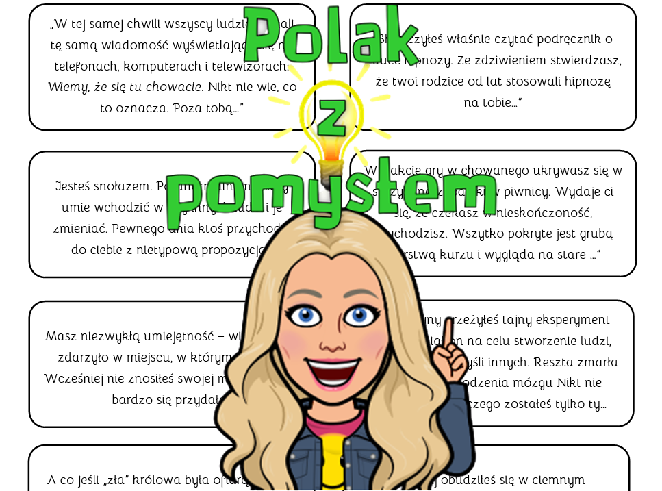 Ten niezwykły (wręcz magiczny) zestaw zawiera 84 karty z fragmentami wciągających opowieści, które aż proszą się o dokończenie. Całość stanowi olbrzymia bibliotekę potencjalnych historii opowiedzianych przez uczniów. Duża część jest w klimacie fantastycznym, gdyż takie opowieści najbardziej rozpalają uczniowska wyobraźnię. Świetnie nadaje się do losowania (przy takiej ilości po kilka różnych kart na ucznia) i wyboru tej historii, która najbardziej wciągnie ucznia. Nadają się na intrygujące początki lub środki opowiadań (ja wymagam umieszczenia tekstu z karty w wypracowaniu), a niektóre na zaskakujące zakończenia. Tworząc je sama miałam ochotę napisać kilka niesamowitych opowieści. Ten materiał można też zastosować jako comiesięczne wyzwanie pisarskie rozpisujące uczniów lub ćwiczenie storytellingu w czasie lekcji - świetnie sprawdzi się też na godzinie wychowawczej, wycieczce, zajęciach integracyjnych lub nocowaniu w szkole, gdy uczniowie będą musieli stworzyć jak najbardziej zaskakującą historię...