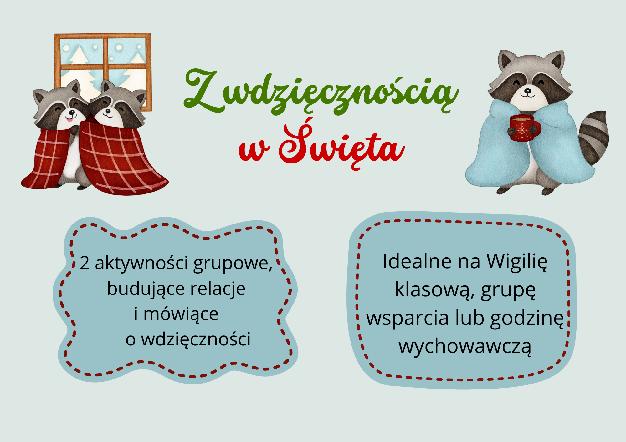 Ten mini zestaw świątecznych aktywności powstał z myślą o nauczycielach oraz osobach prowadzących grupy dziecięce i młodzieżowe – w szkołach, świetlicach, na TUS-ach, zajęciach socjoterapeutycznych czy w grupach wsparcia.