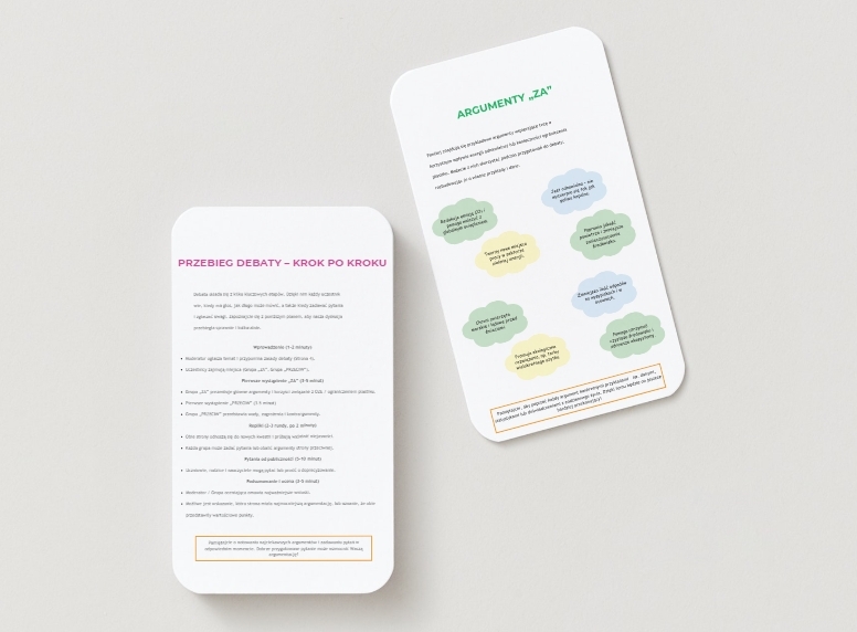 - Szczegółowe wyjaśnienie, jak wyłonić grupy „Za” i „Przeciw” oraz rolę moderatora/oceniającego.