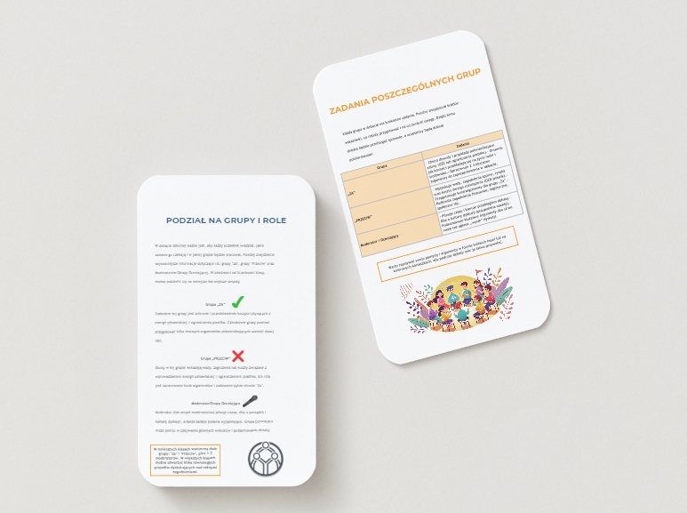 - Dokładny opis obowiązków każdej grupy (m.in. zbieranie argumentów, zadawanie pytań, przygotowanie kontrargumentów).