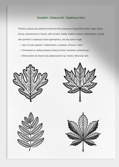 - Załączniki i karty pracy (strony 11–12) – gotowe do wydrukowania szablony liści oraz karta pracy „Dopasuj liść do drzewa”. Dzieci mogą je wyciąć, pokolorować lub wykorzystać do ćwiczeń i zabaw plastycznych.