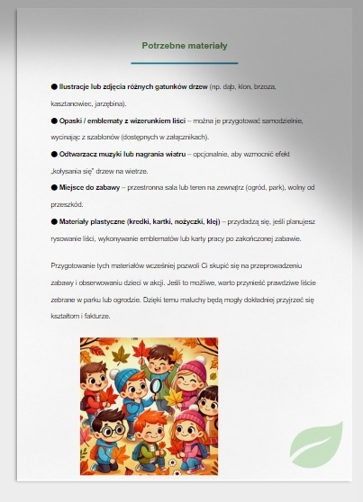 Przenieś dzieci w radosny świat tańczących liści i szumiących drzew! Dzięki temu materiałowi zorganizujesz atrakcyjne, przemyślane zajęcia, które przybliżą najmłodszym przyrodę i zachęcą do aktywności ruchowej. Zapewnij swoim podopiecznym niezapomnianą przygodę z naturą!