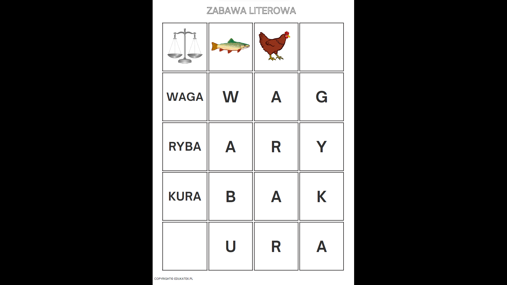 Zadaniem dziecka jest odszukanie, ułożenie i odczytanie właściwych liter oraz wyrazów pod wybranymi obrazkami. Dzieci mogą dostać pomoce do samodzielnego wycięcia, dzięki czemu poćwiczą sprawność manualną lub można przygotować wersję zalaminowaną z przyklejonymi rzepami, na które dziecko tylko przykleja właściwe litery/wyrazy. Zestaw doskonale sprawdzi się zarówno podczas pracy z grupą przedszkolną/szkolną, jak również podczas pracy indywidualnej z dzieckiem.