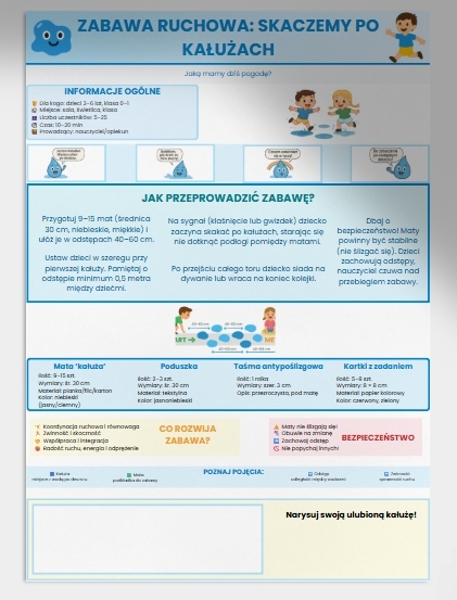 – Proste zasady: rozłóż niebieskie maty (kałuże), ustaw dzieci w kolejce, zorganizuj bezpieczny tor, wydaj sygnał startowy, obserwuj radość i rozwój ruchowy!