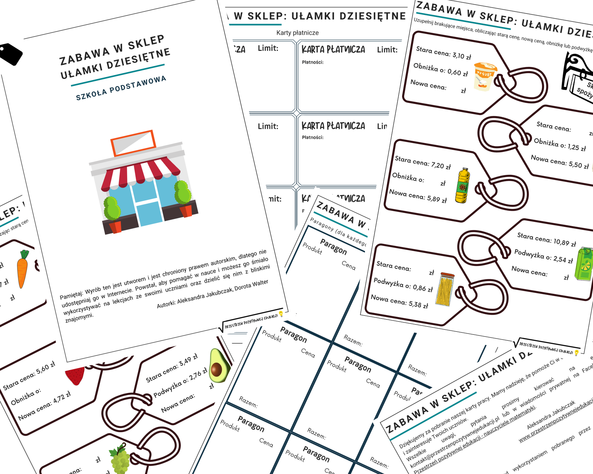 Gra z ułamkami dziesiętnymi składająca się z etykiet, paragonów i kart płatniczych