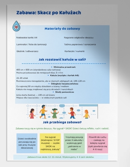 Wyjątkowy materiał cyfrowy, który łączy naukę, ruch i radość! Idealny dla nauczycieli, wychowawców, terapeutów i rodziców dzieci w wieku 3–8 lat 👧👦. Zabawa inspirowana deszczową pogodą rozwija motorykę dużą, koordynację i refleks, a przy tym daje mnóstwo frajdy!